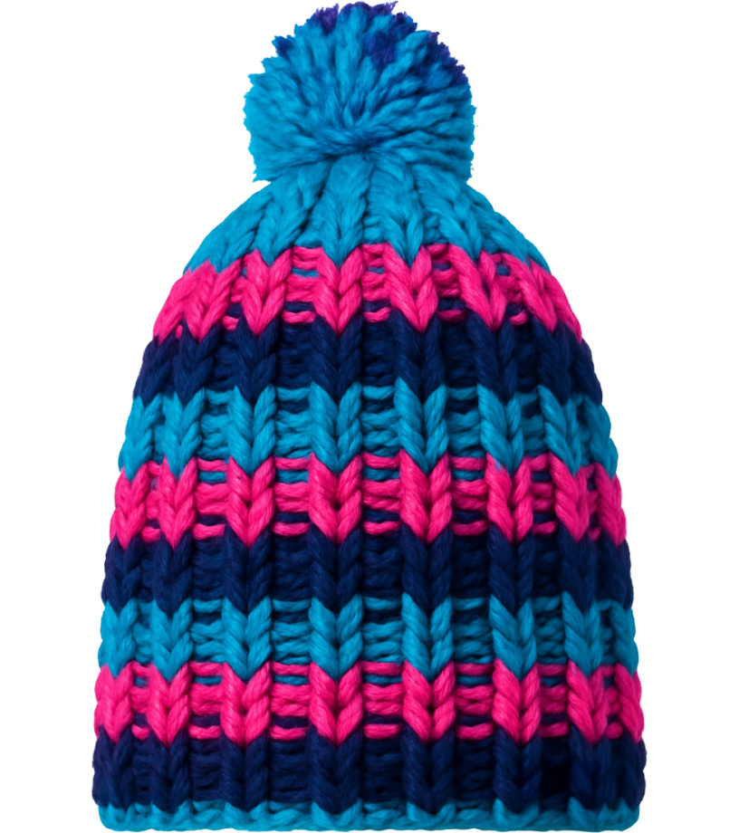 Pletená zimní čepice s hrubým vzorem a vícebarevným designem v odstínech modré a růžové je ideální volbou pro chladné dny. Je vyrobená z měkkého, hřejivého materiálu, který zajišťuje pohodlí a tepelný komfort. Stylový bambulík dodává čepici hravý vzhled, takže se skvěle hodí jak na zimní procházky, tak i do města.