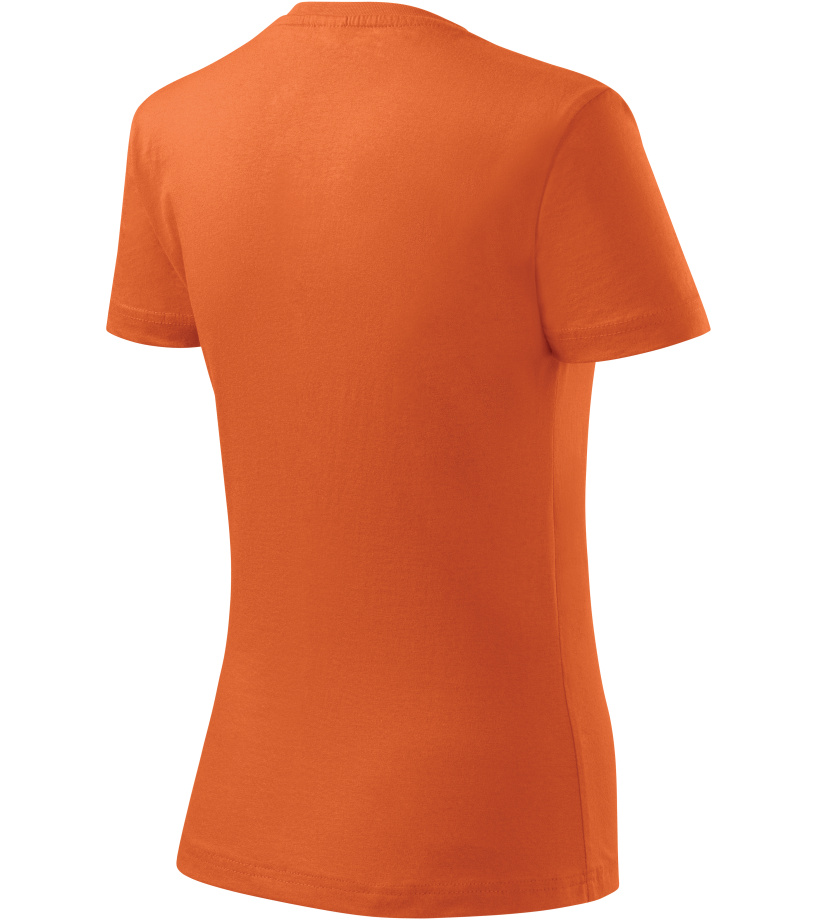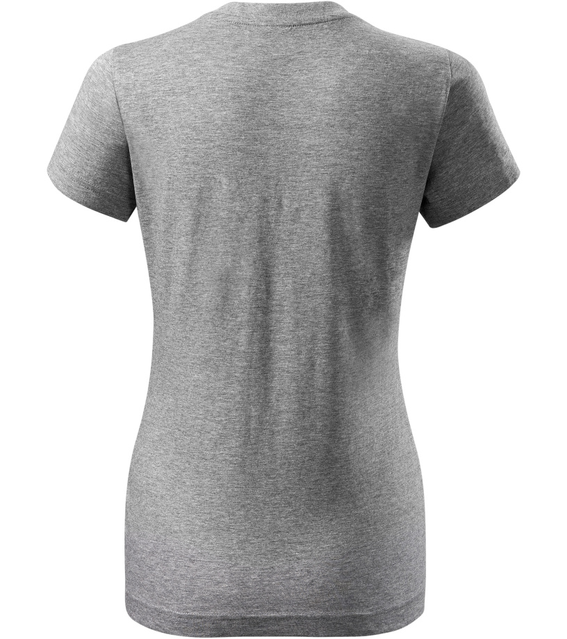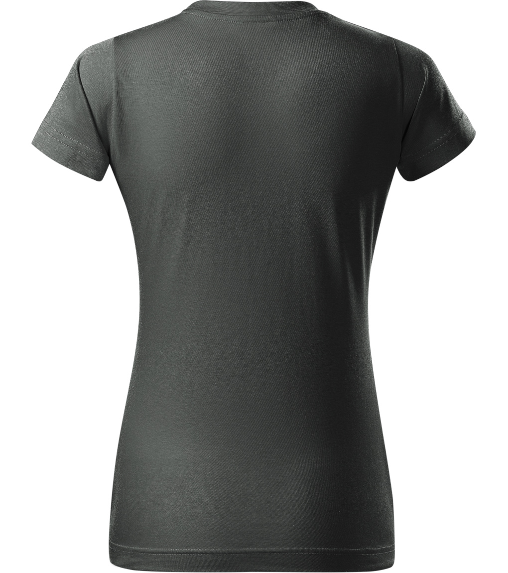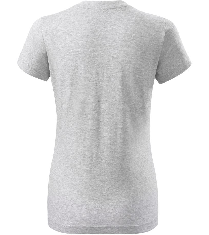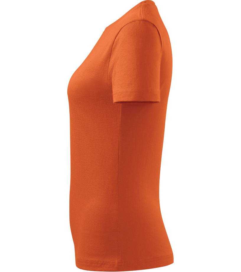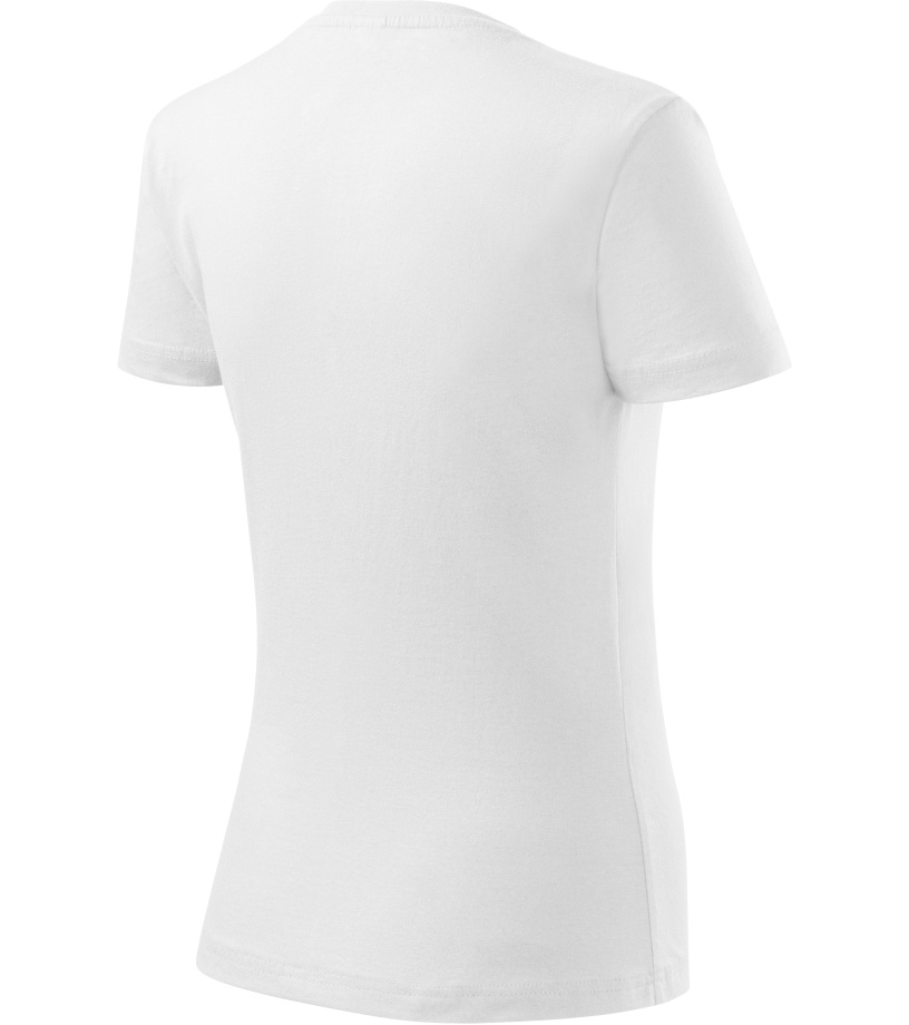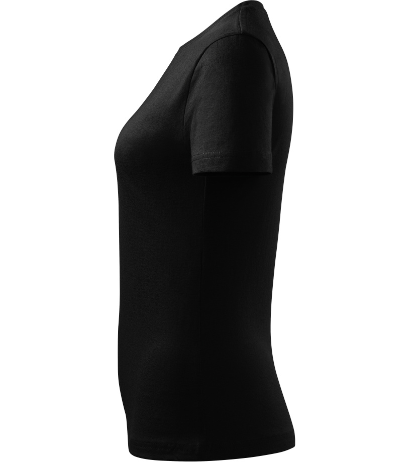 Kvalitní dámské tričko lehce projmutého střihu s bočními švy vhodné pro potisk a výšivky má úzký lem průkrčníku z žebrového úpletu 1:1 s 5 % elastanu, vnitřní část průkrčníku začištěna páskou z vrchového materiálu, zpevnění ramenních švů páskou a silikonovou úpravu.
