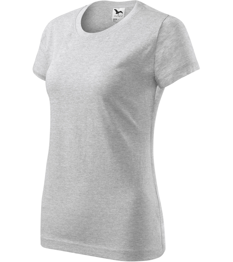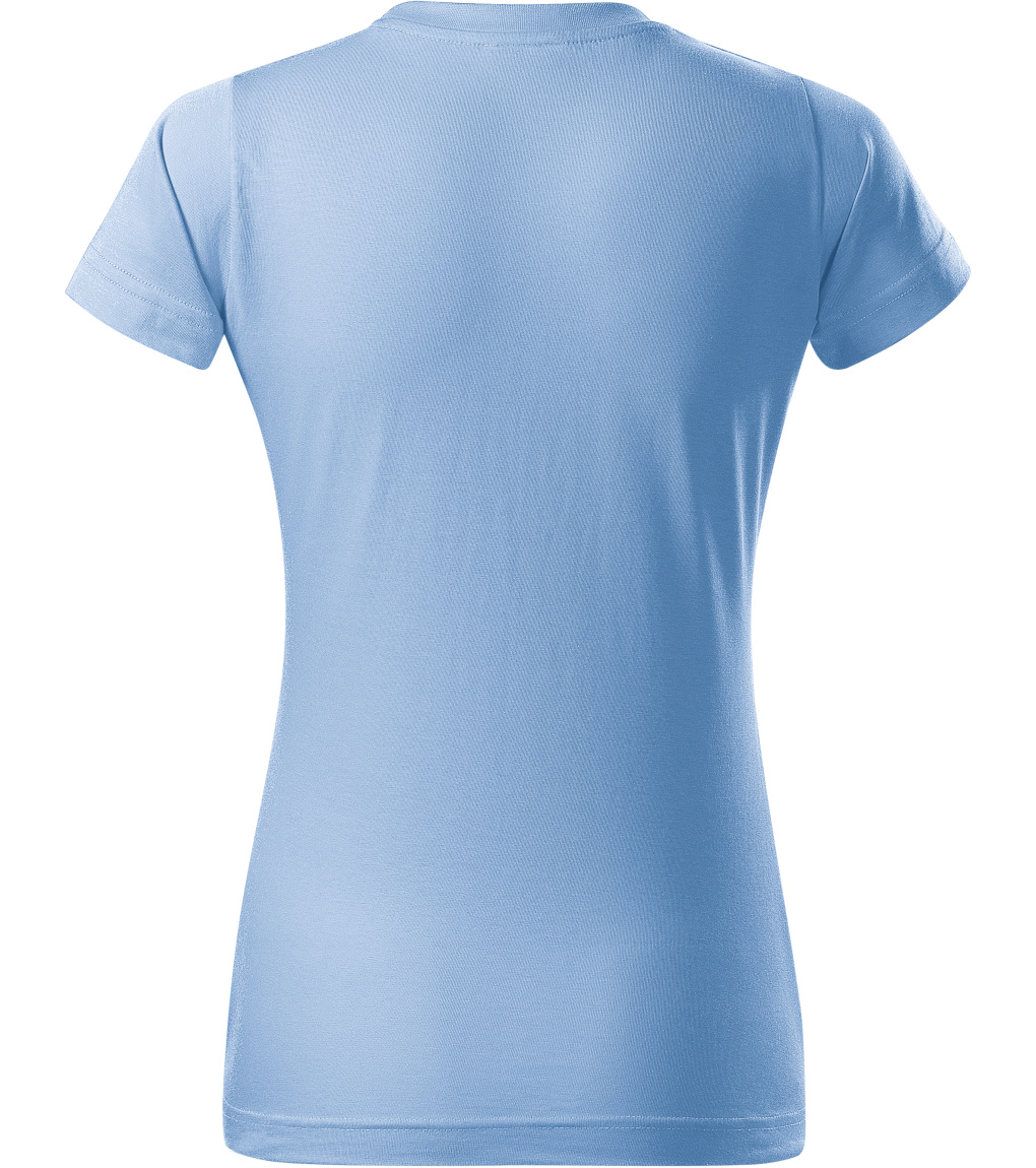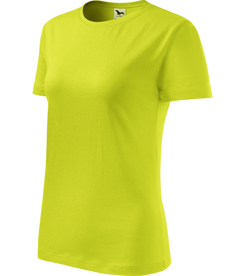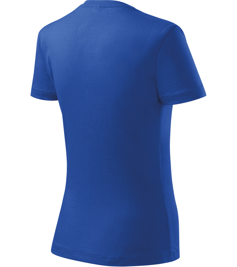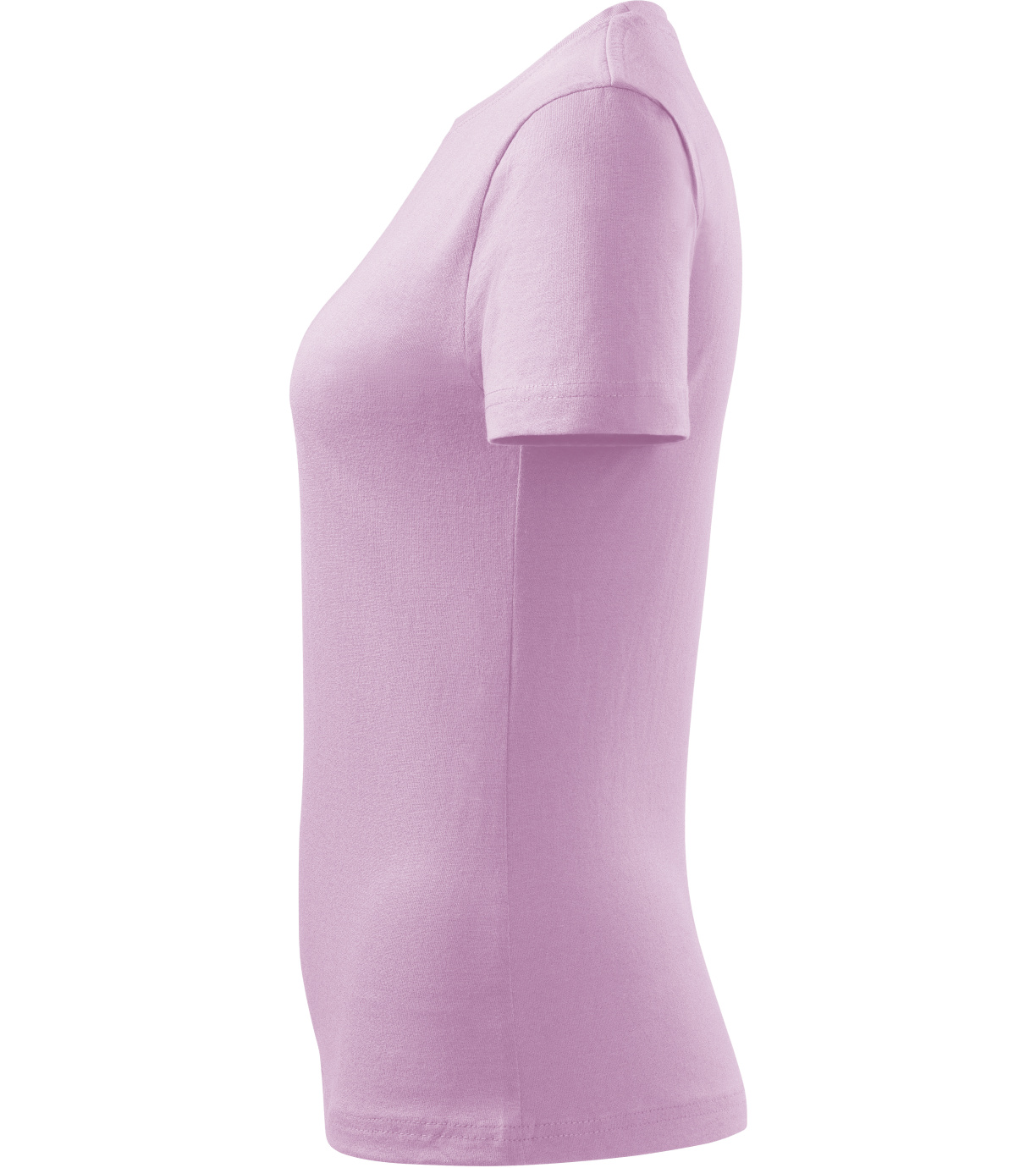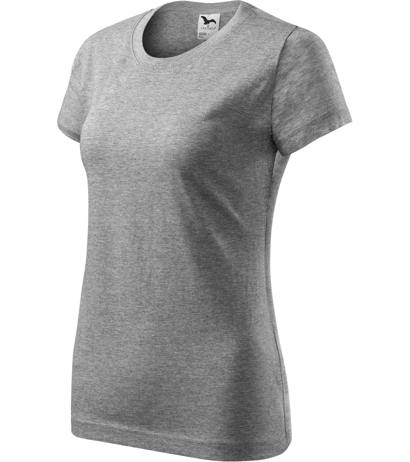 Kvalitní dámské tričko lehce projmutého střihu s bočními švy vhodné pro potisk a výšivky má úzký lem průkrčníku z žebrového úpletu 1:1 s 5 % elastanu, vnitřní část průkrčníku začištěna páskou z vrchového materiálu, zpevnění ramenních švů páskou a silikonovou úpravu.