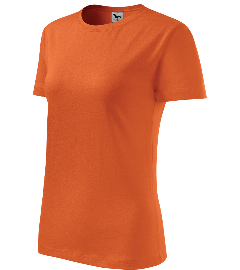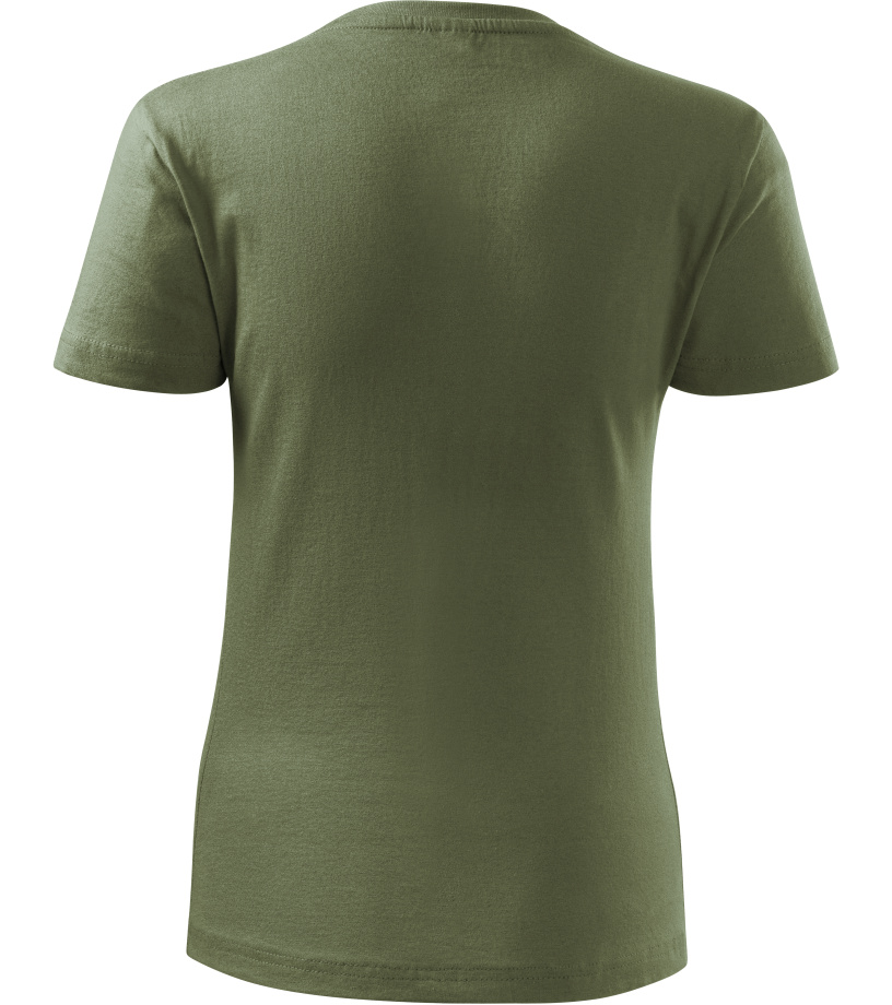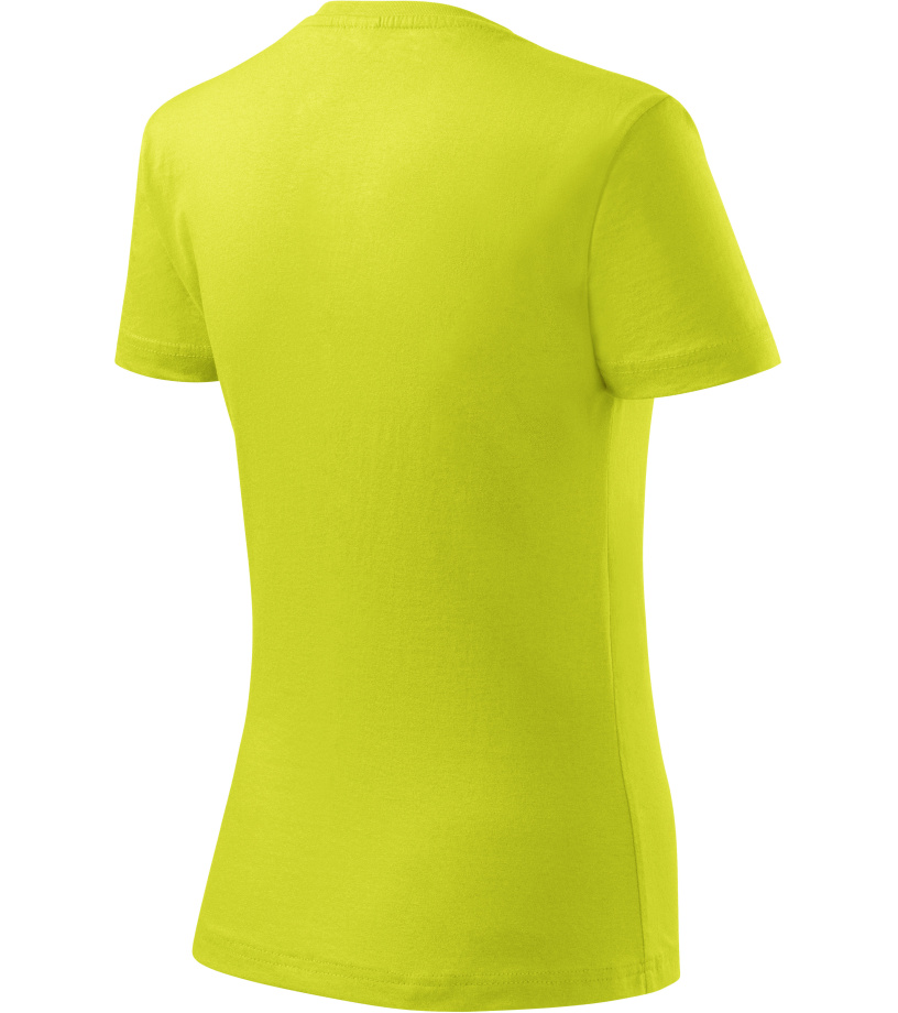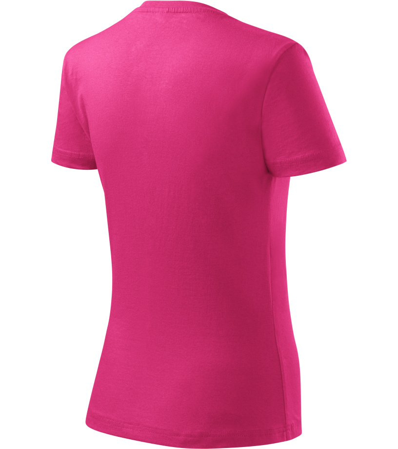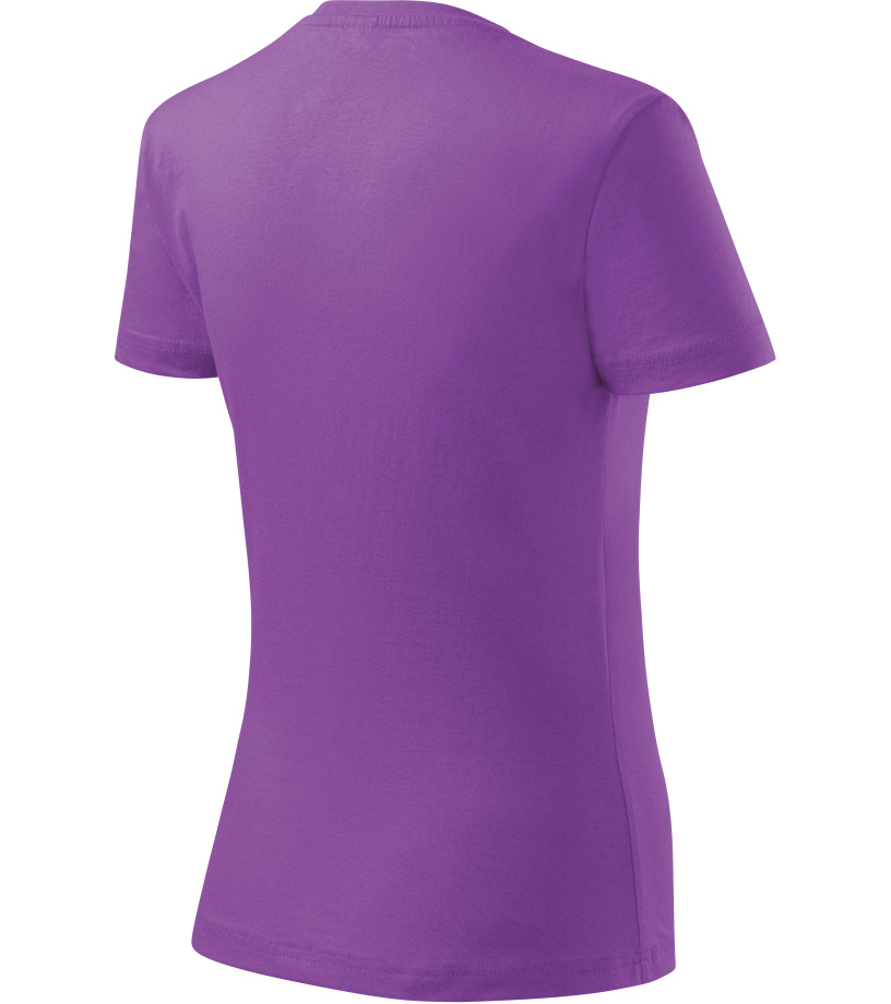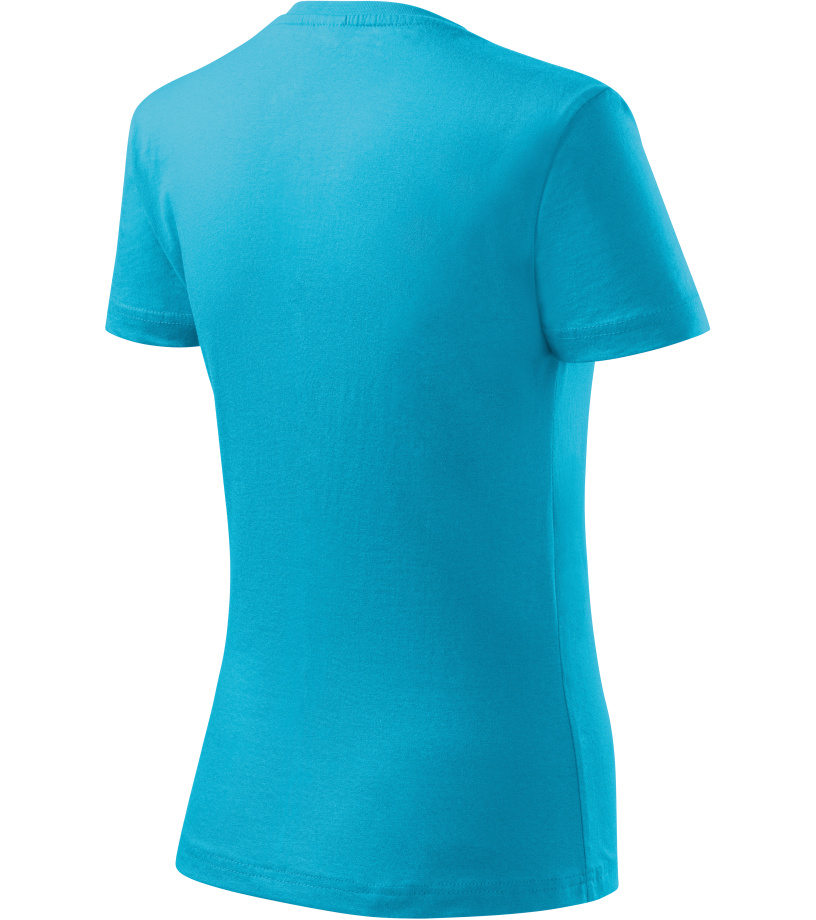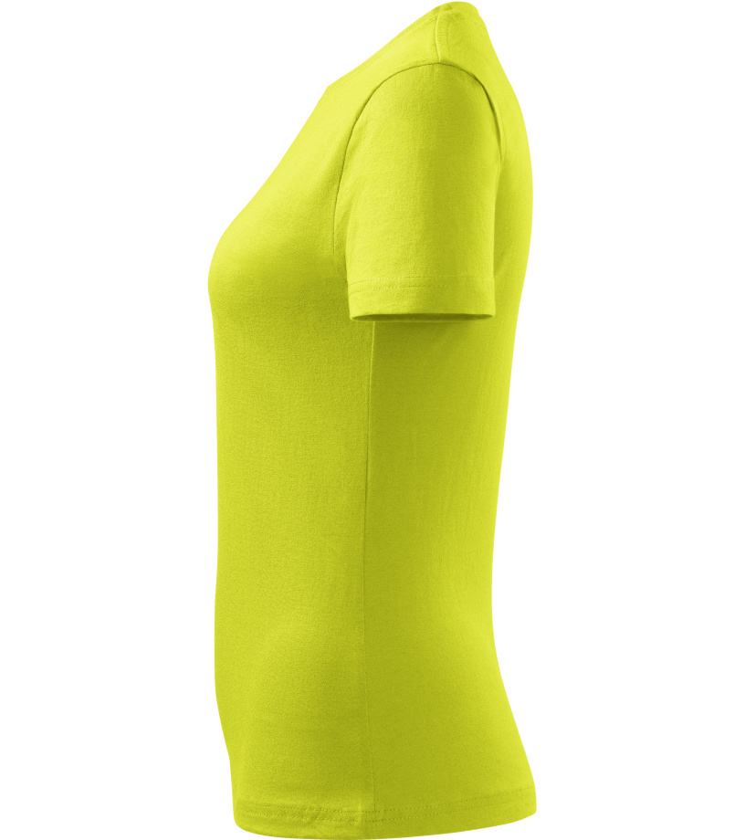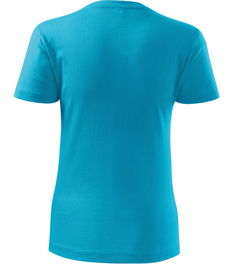 Kvalitní dámské tričko lehce projmutého střihu s bočními švy vhodné pro potisk a výšivky má úzký lem průkrčníku z žebrového úpletu 1:1 s 5 % elastanu, vnitřní část průkrčníku začištěna páskou z vrchového materiálu, zpevnění ramenních švů páskou a silikonovou úpravu.