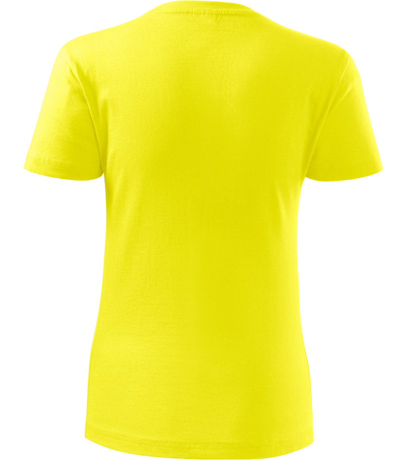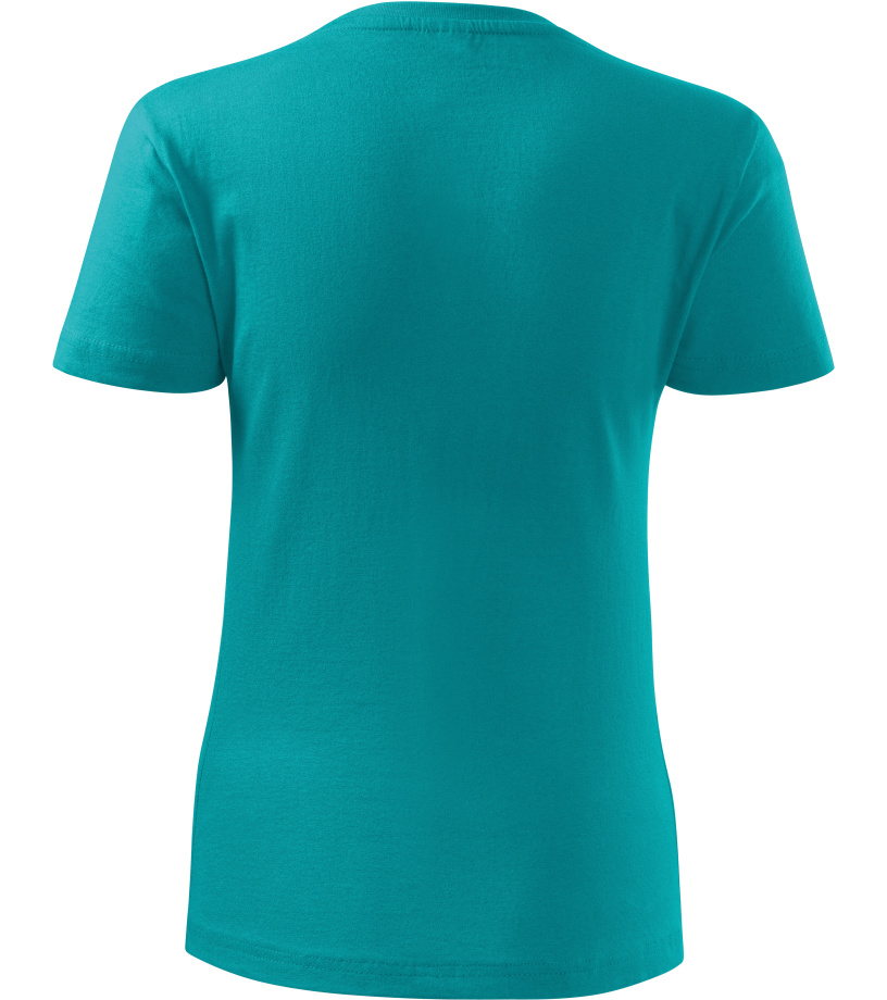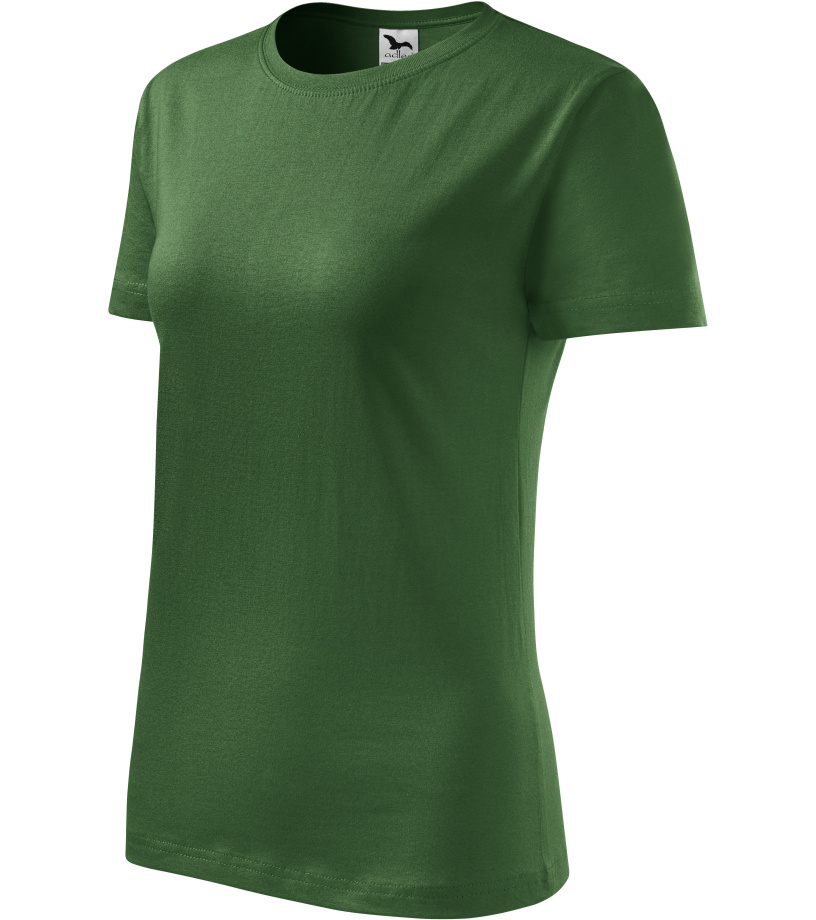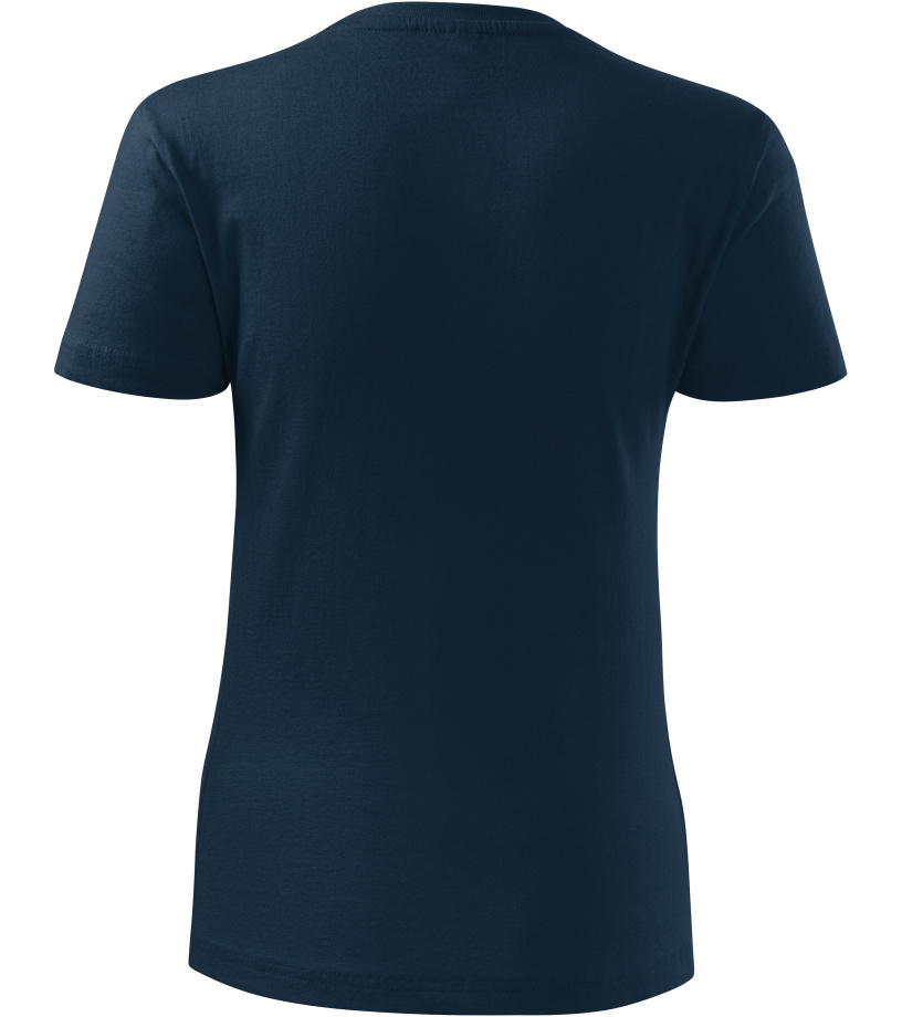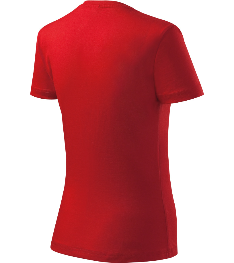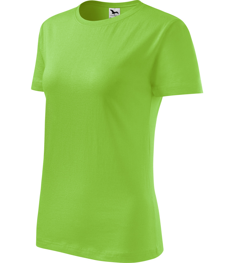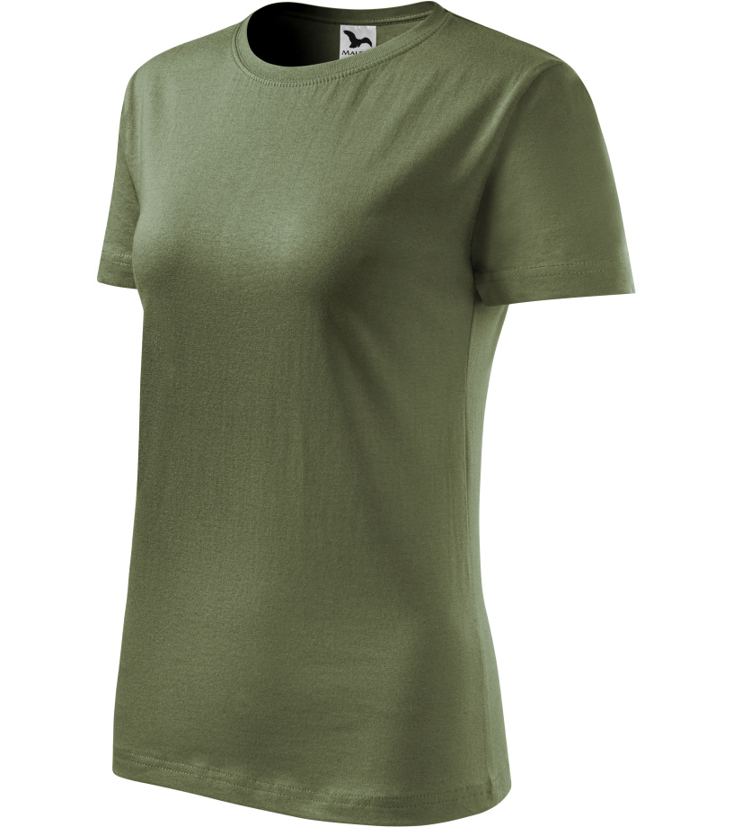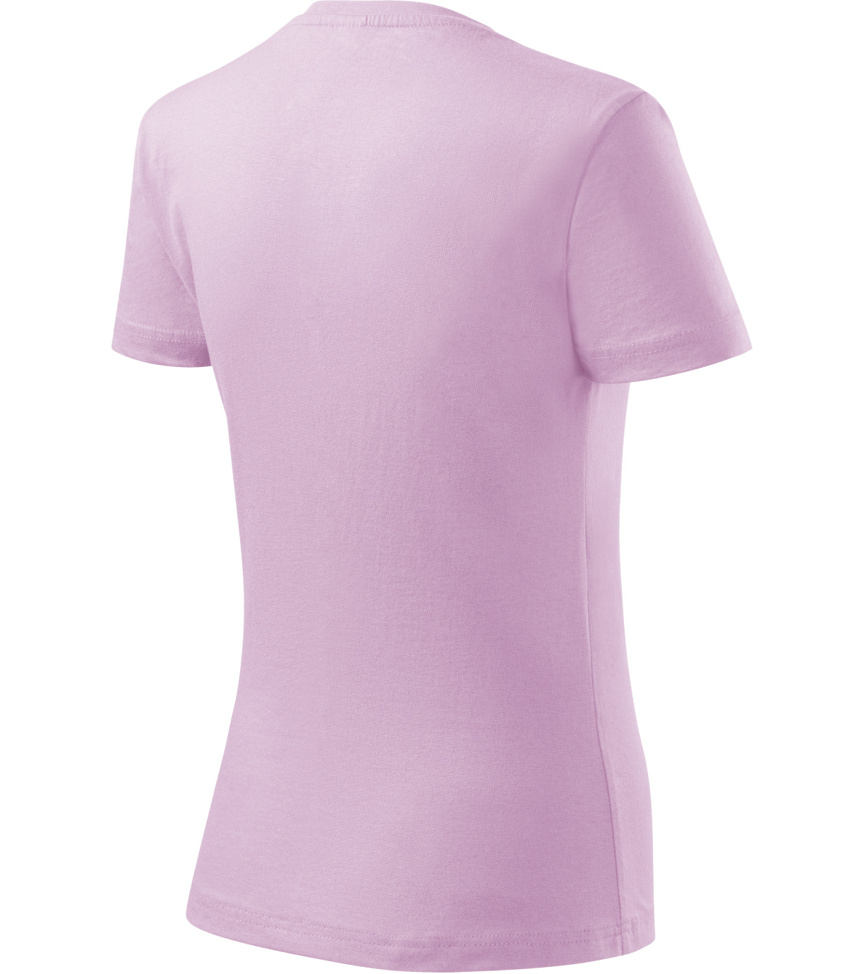 Kvalitní dámské tričko lehce projmutého střihu s bočními švy vhodné pro potisk a výšivky má úzký lem průkrčníku z žebrového úpletu 1:1 s 5 % elastanu, vnitřní část průkrčníku začištěna páskou z vrchového materiálu, zpevnění ramenních švů páskou a silikonovou úpravu.