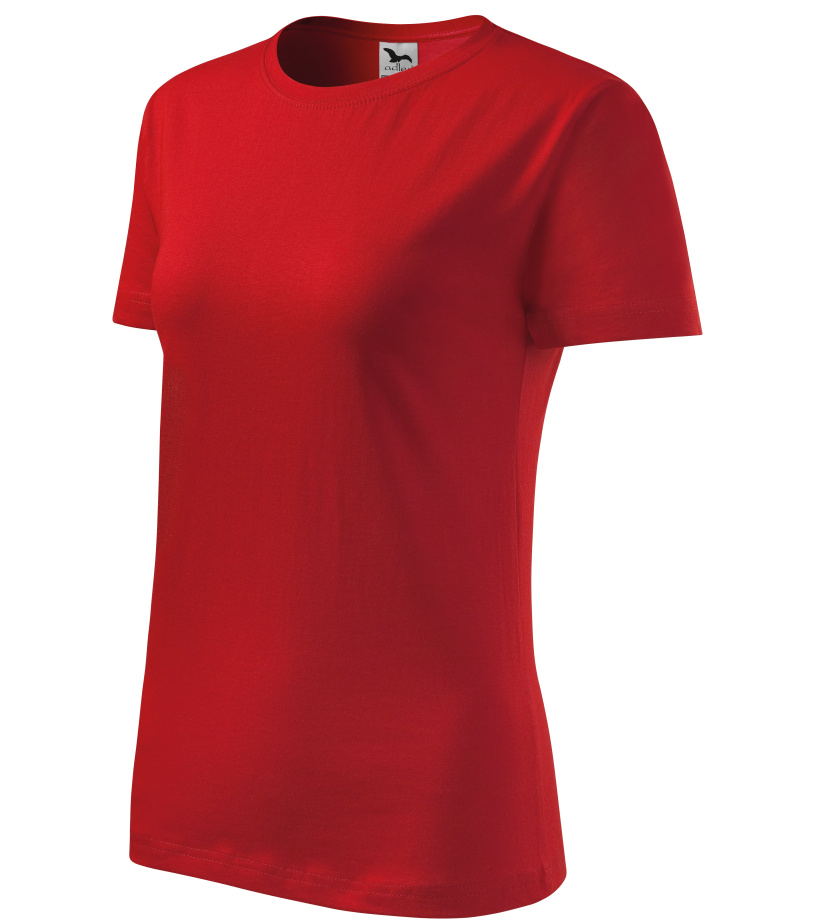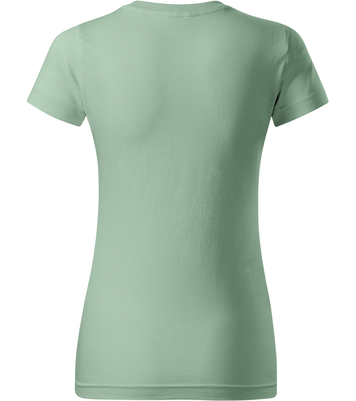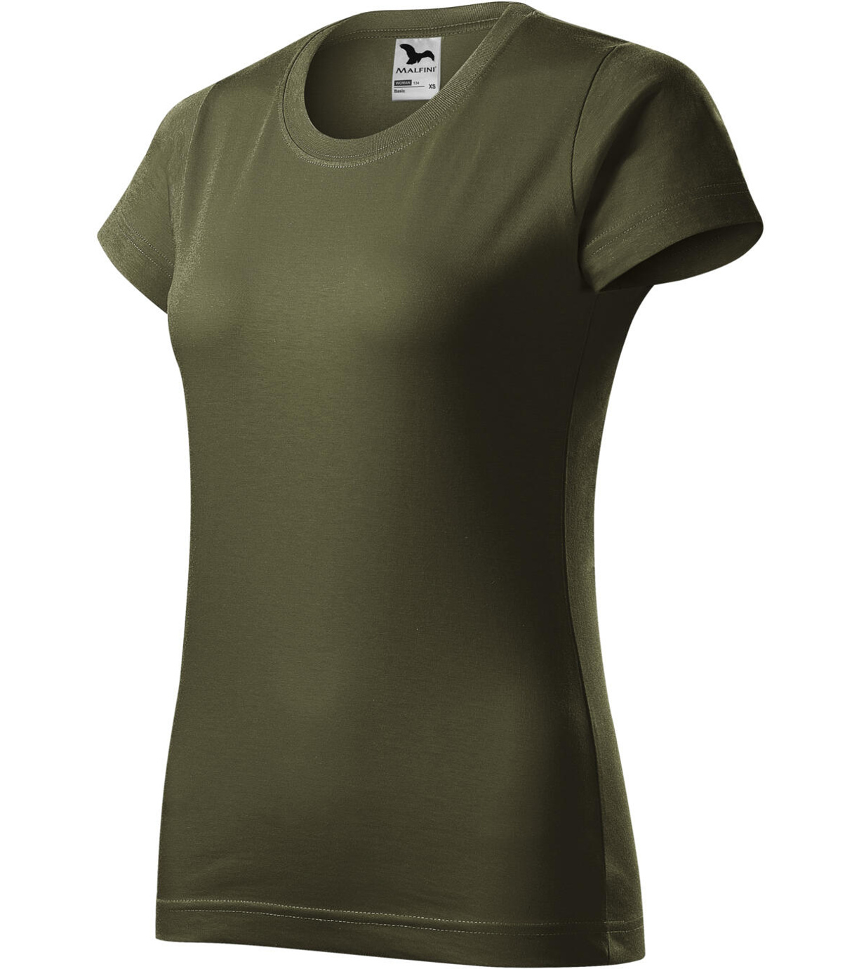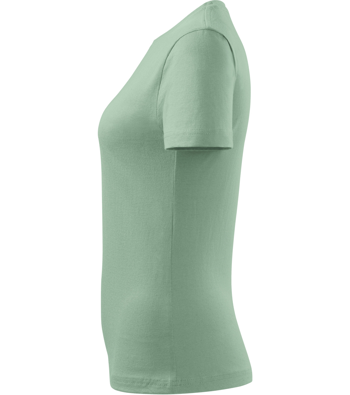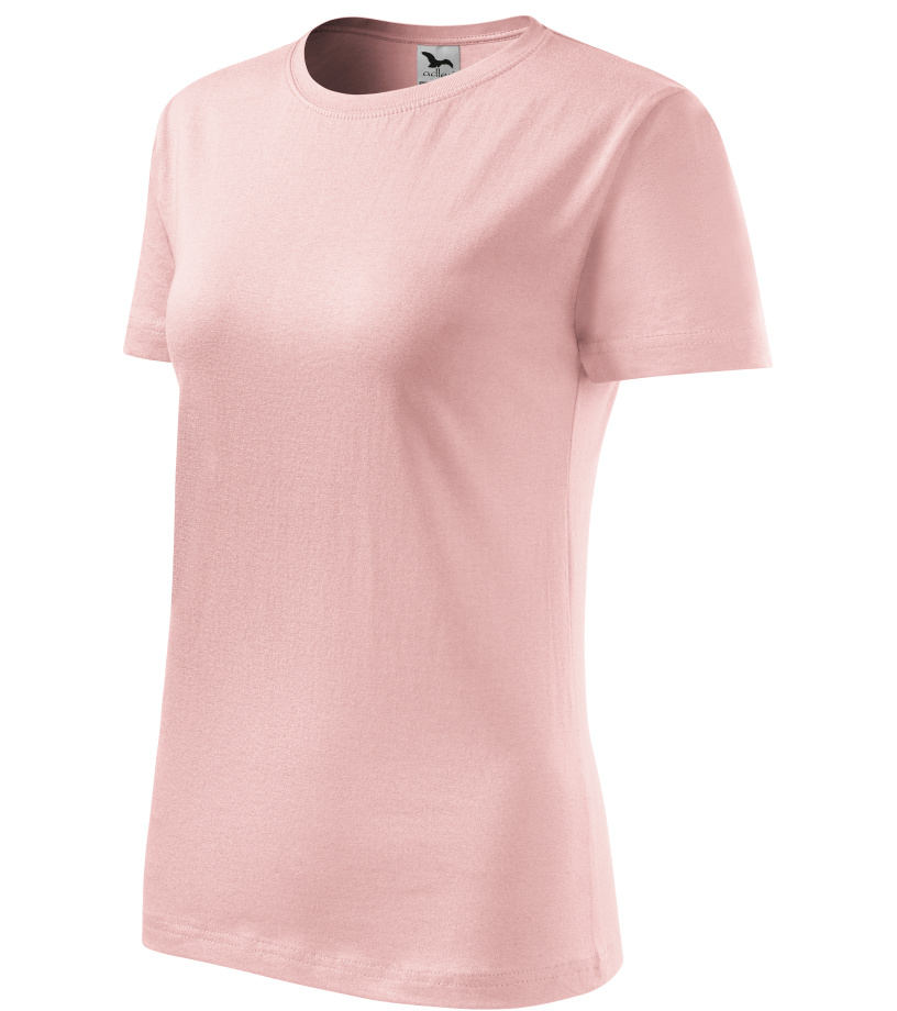 Kvalitní dámské tričko lehce projmutého střihu s bočními švy vhodné pro potisk a výšivky má úzký lem průkrčníku z žebrového úpletu 1:1 s 5 % elastanu, vnitřní část průkrčníku začištěna páskou z vrchového materiálu, zpevnění ramenních švů páskou a silikonovou úpravu.