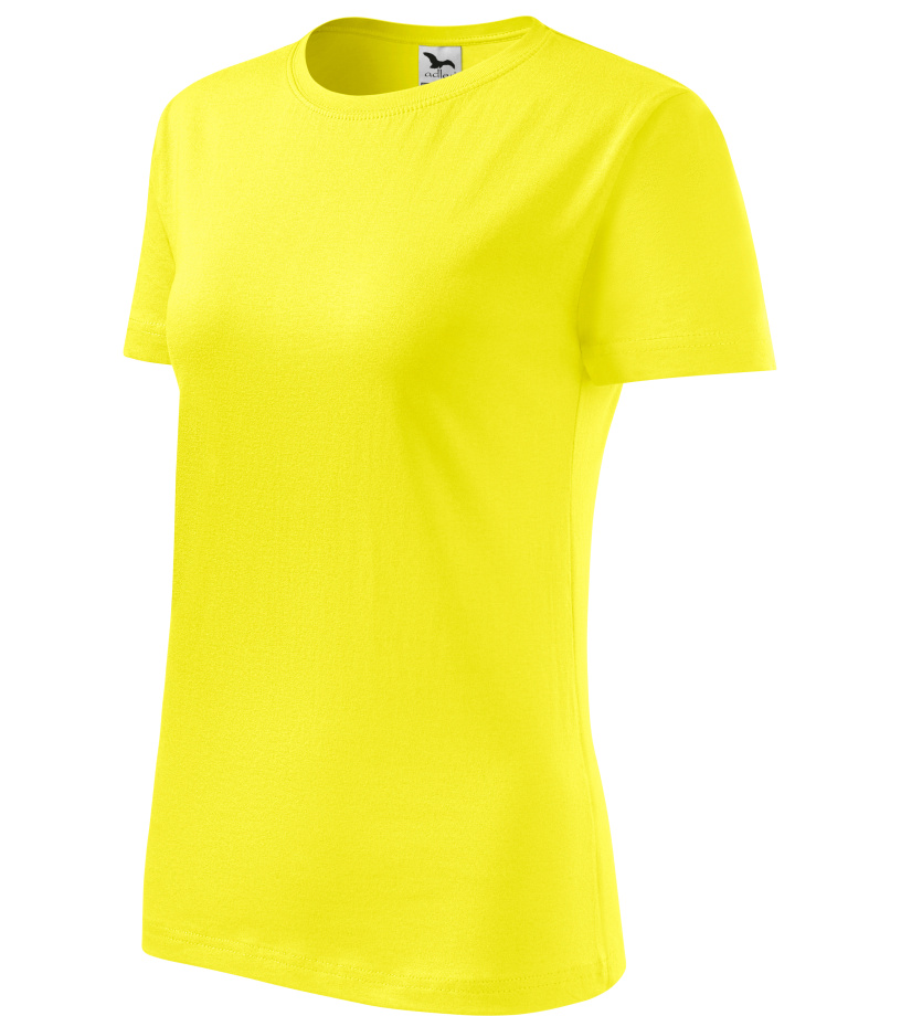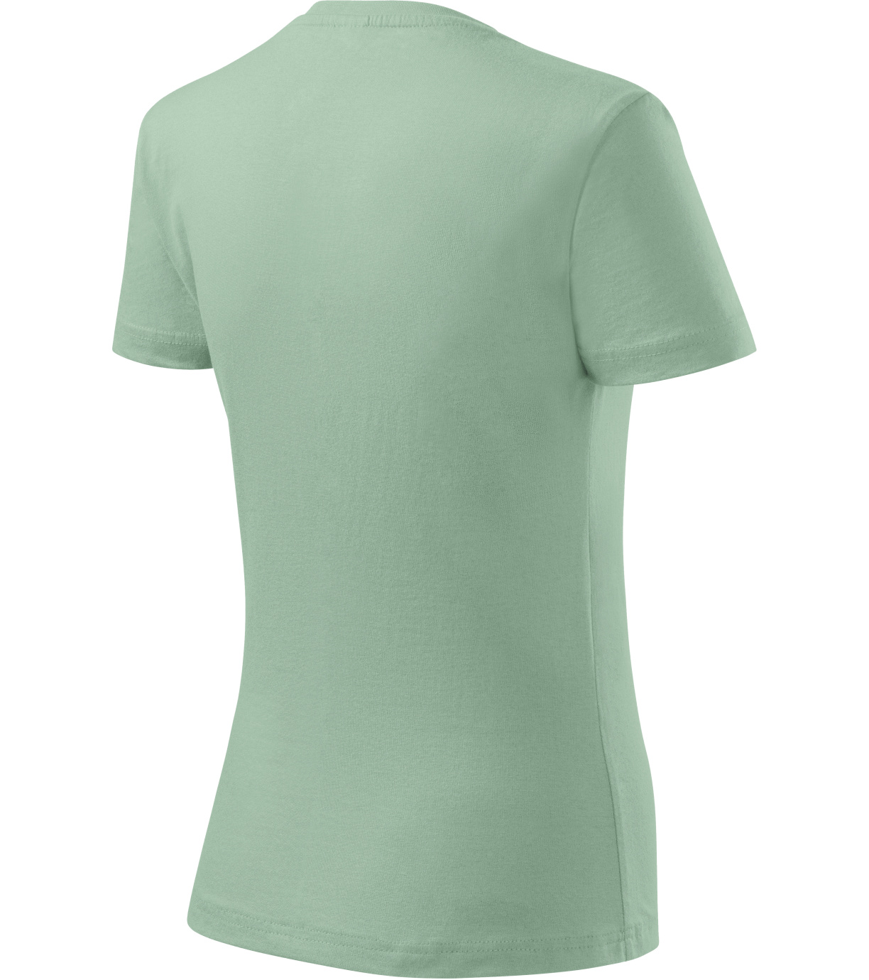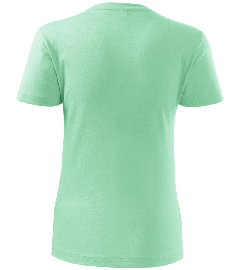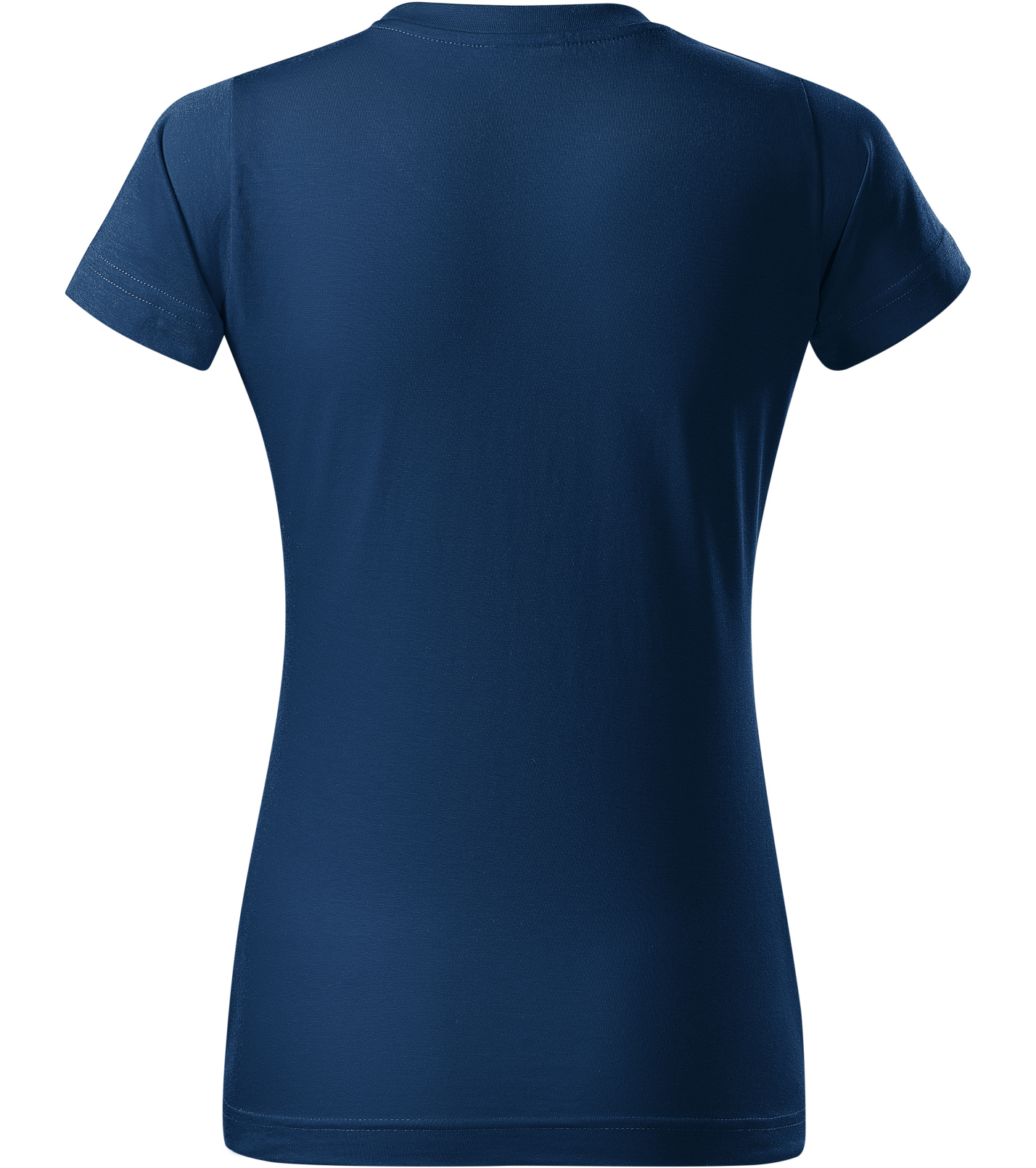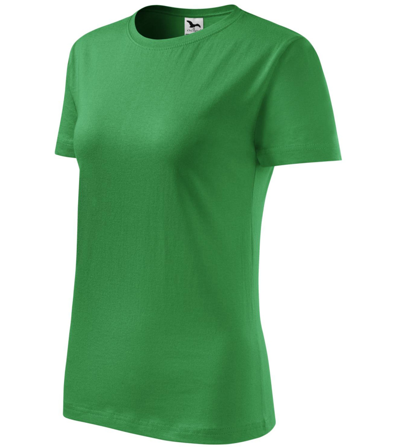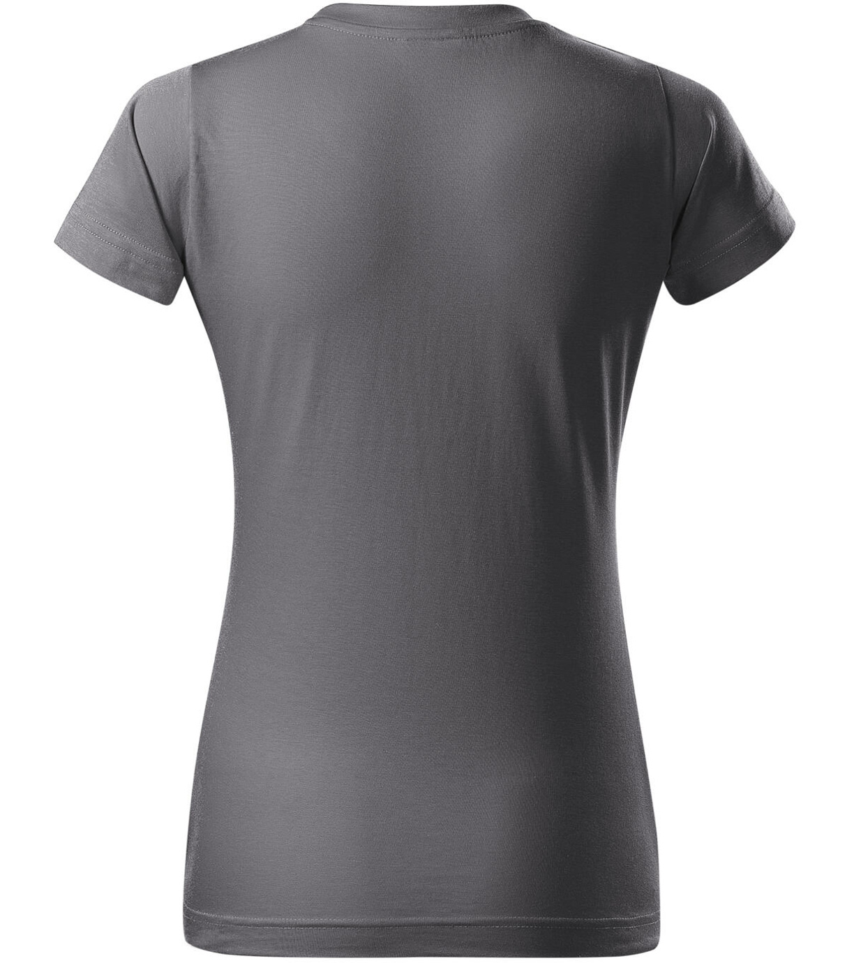 Kvalitní dámské tričko lehce projmutého střihu s bočními švy vhodné pro potisk a výšivky má úzký lem průkrčníku z žebrového úpletu 1:1 s 5 % elastanu, vnitřní část průkrčníku začištěna páskou z vrchového materiálu, zpevnění ramenních švů páskou a silikonovou úpravu.