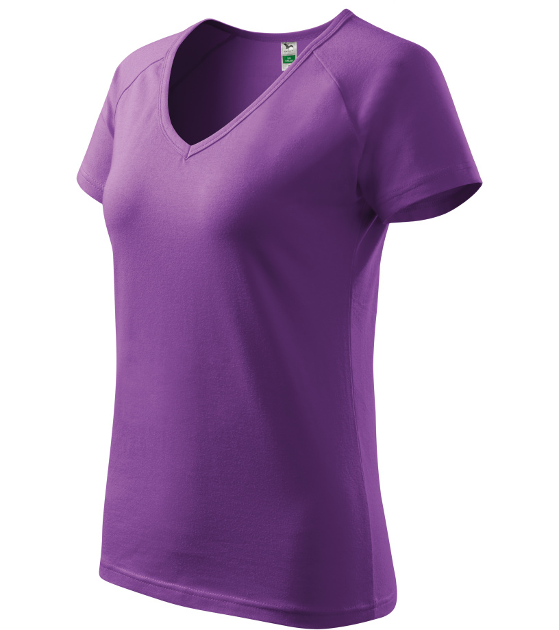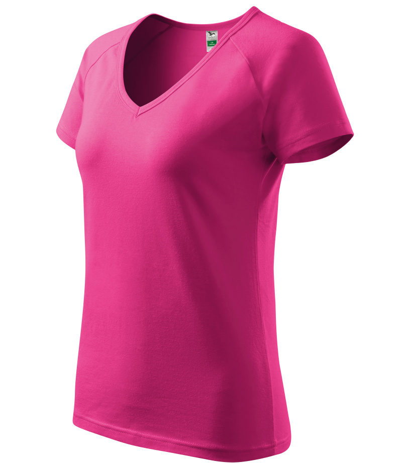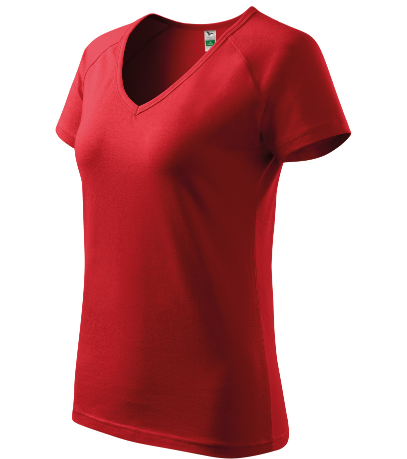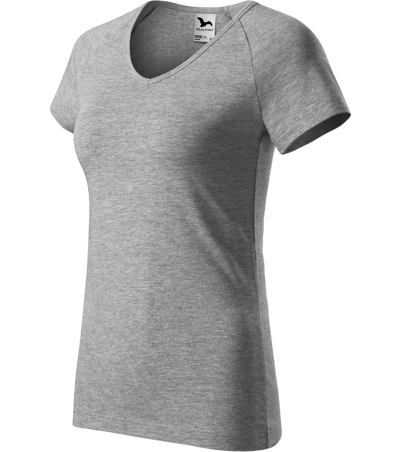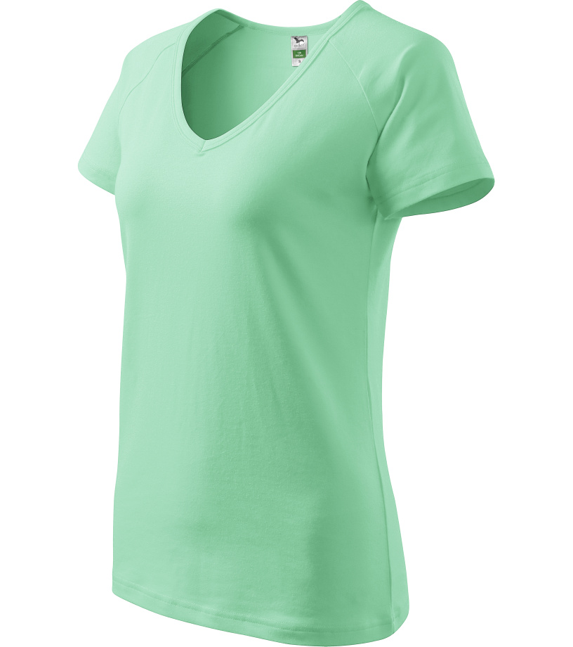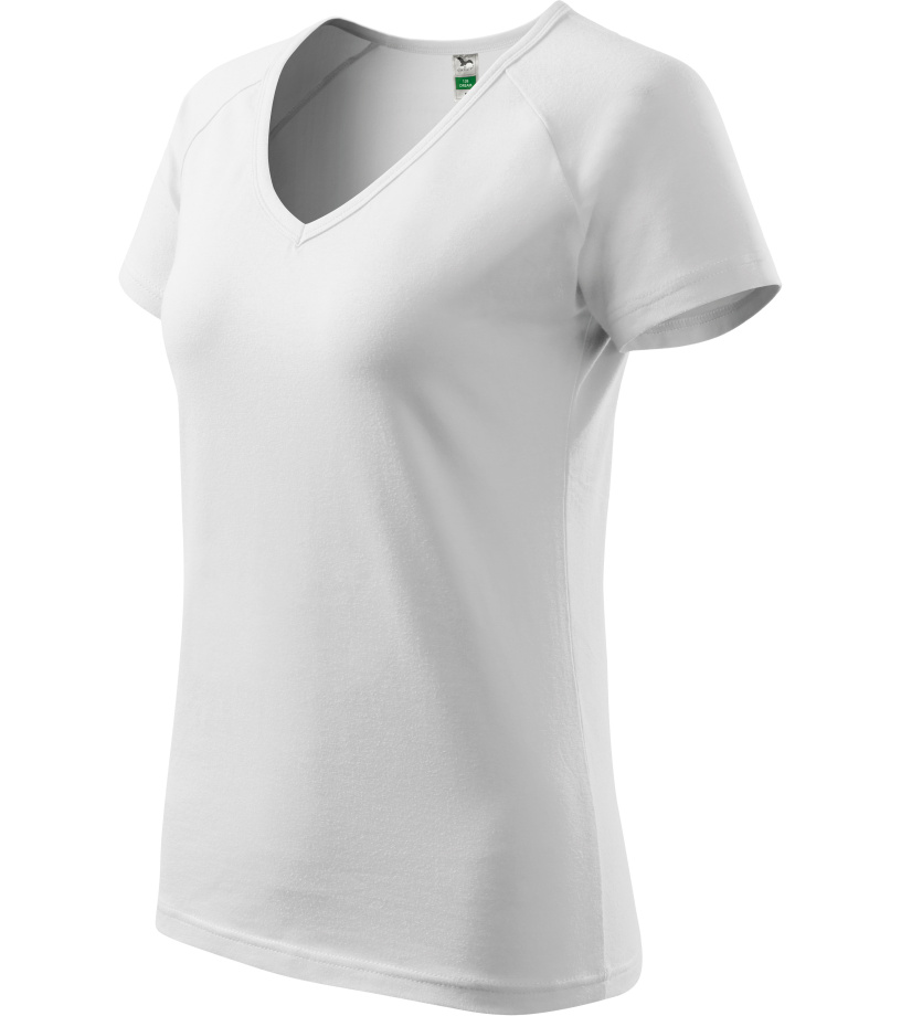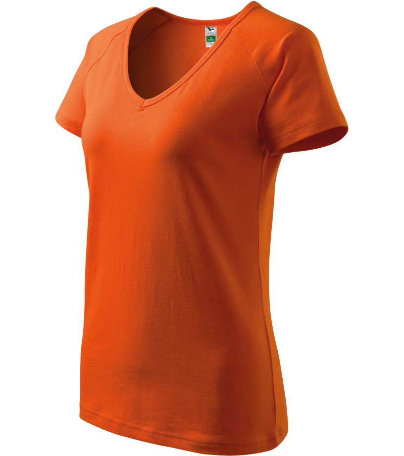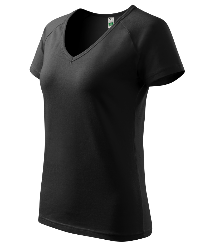 Kvalitní dámské triko přiléhavého stříhu s bočními švy, výstříhem ve tvaru V a krátkými raglánovými rukávy ze strečového materiálu udržujícího stálost tvaru vhodné pro potisk a výšivku má průkrčník lemován vrchovým materiálem