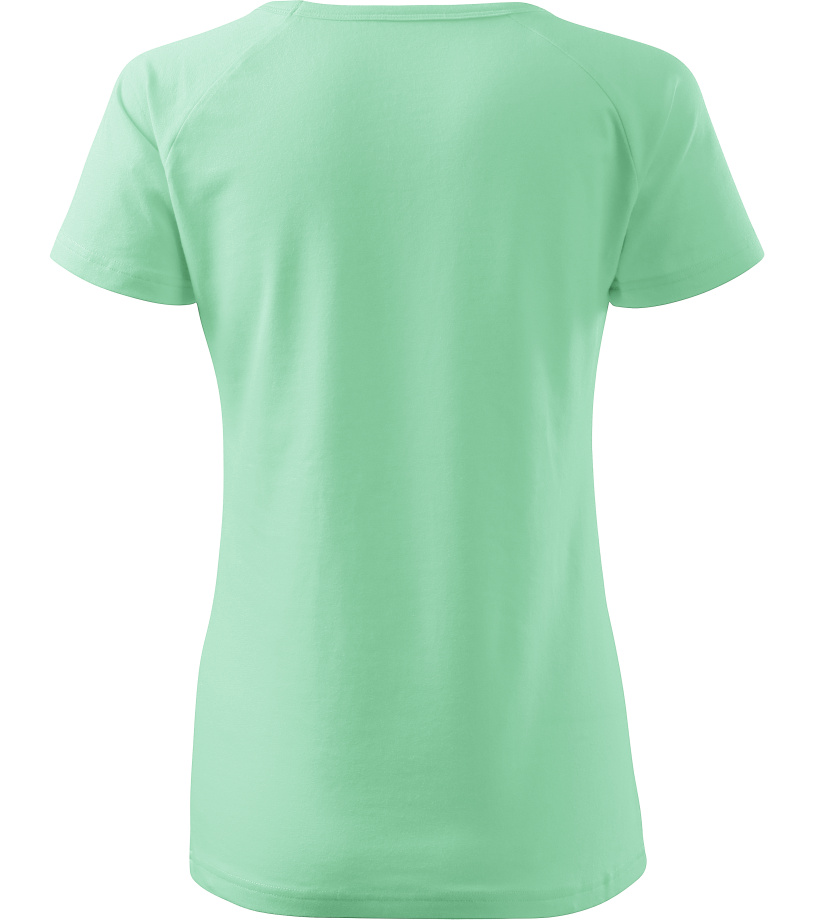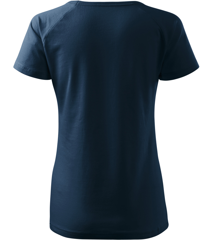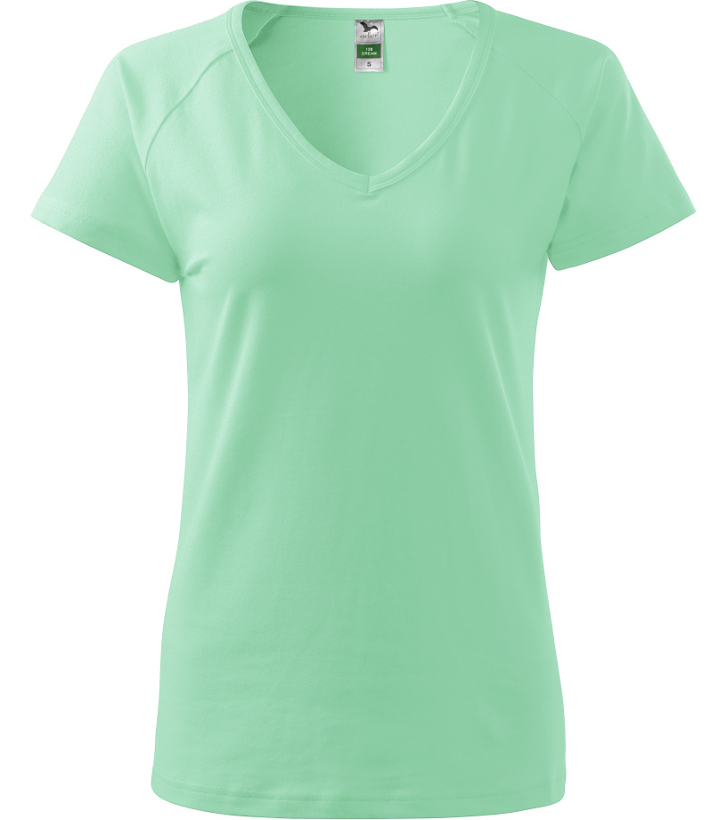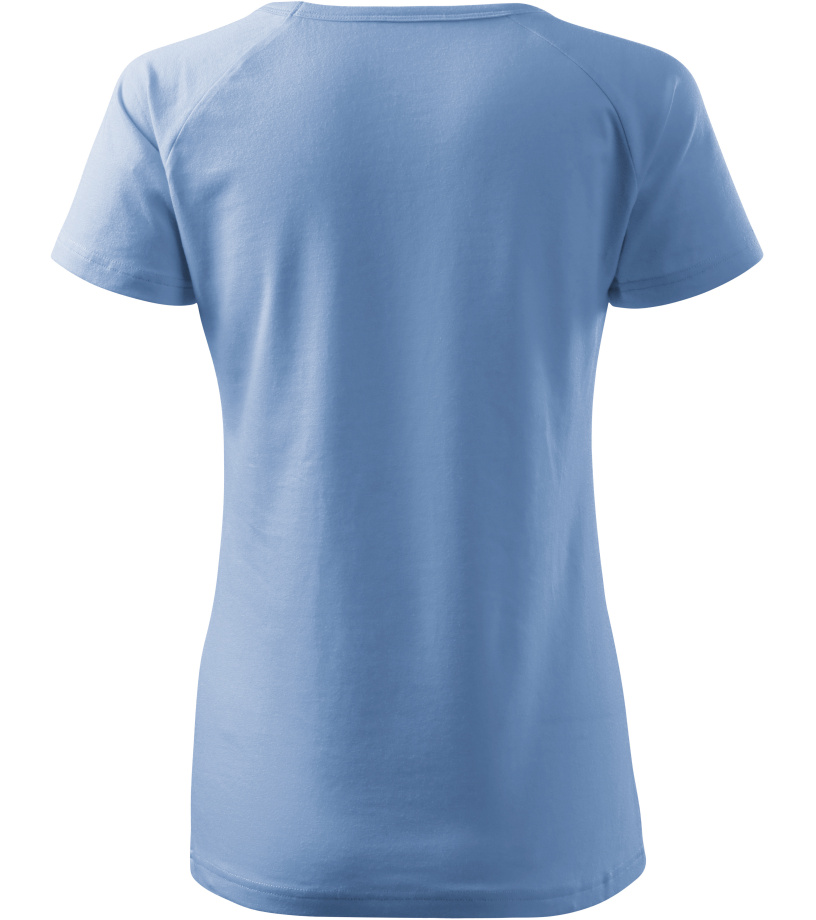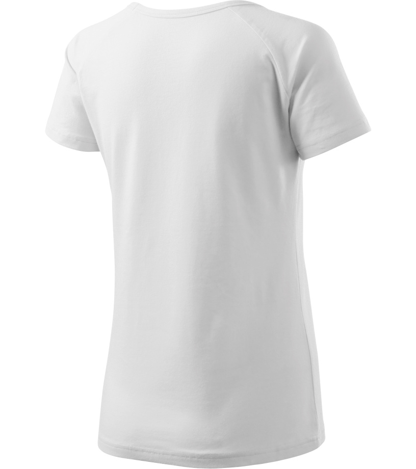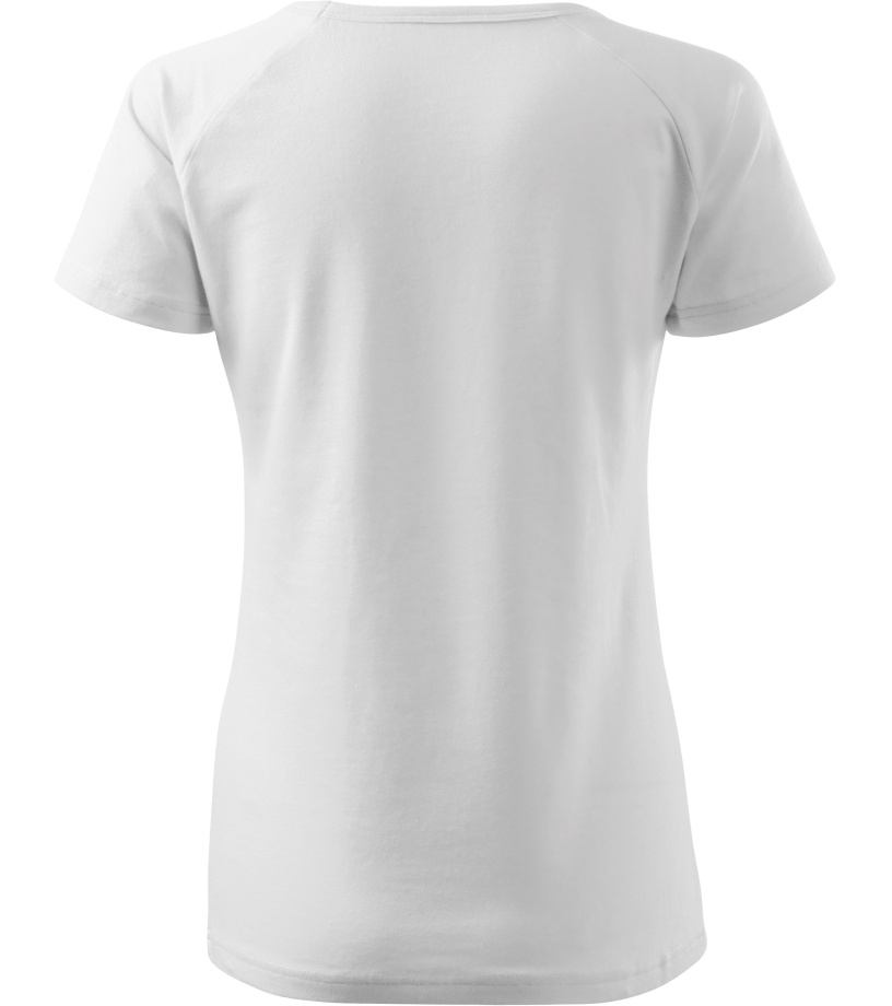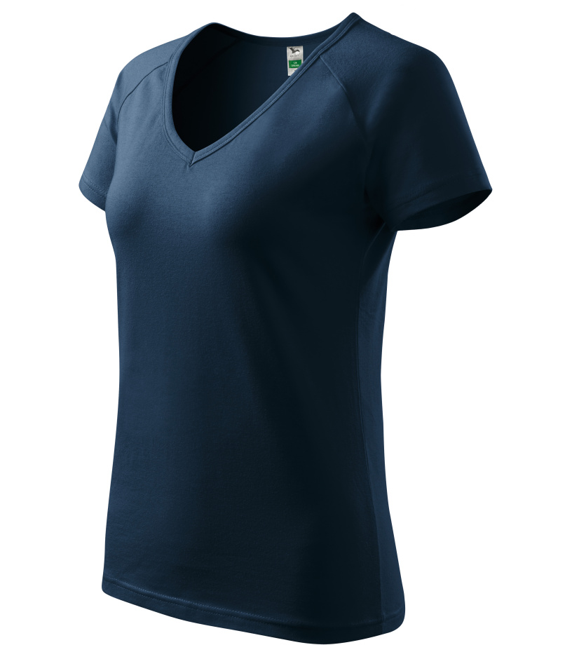 Kvalitní dámské triko přiléhavého stříhu s bočními švy, výstříhem ve tvaru V a krátkými raglánovými rukávy ze strečového materiálu udržujícího stálost tvaru vhodné pro potisk a výšivku má průkrčník lemován vrchovým materiálem