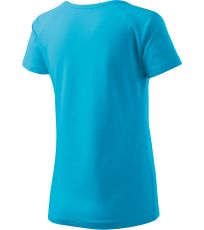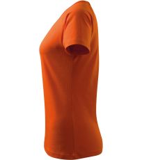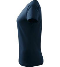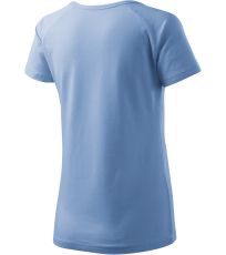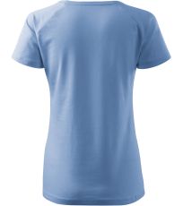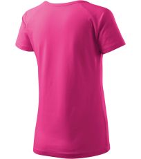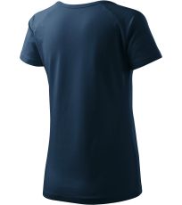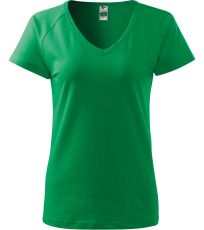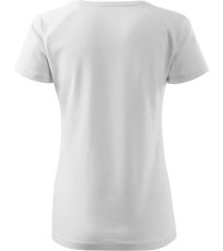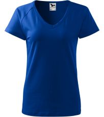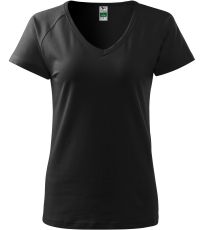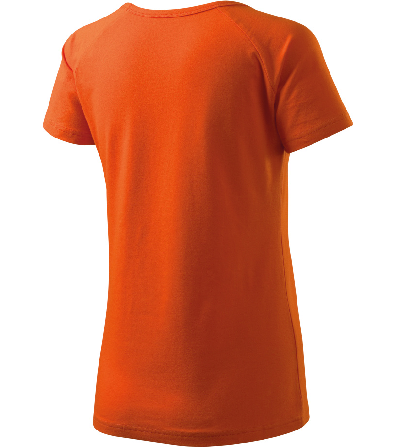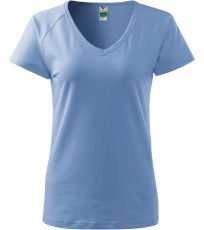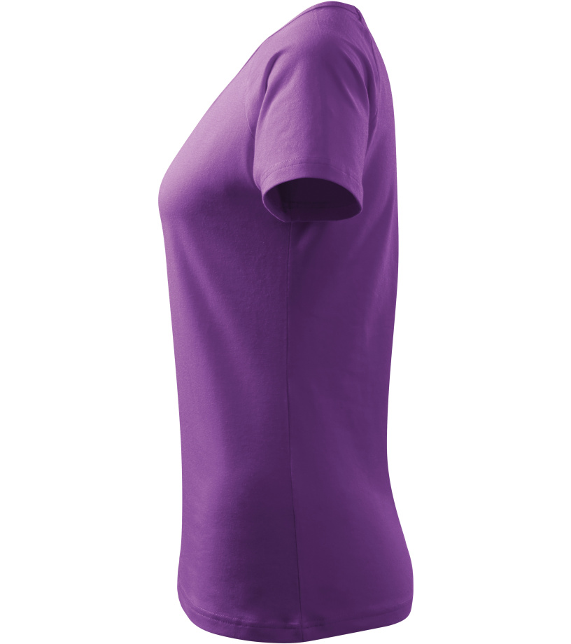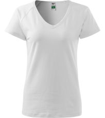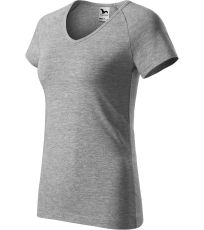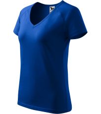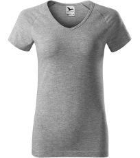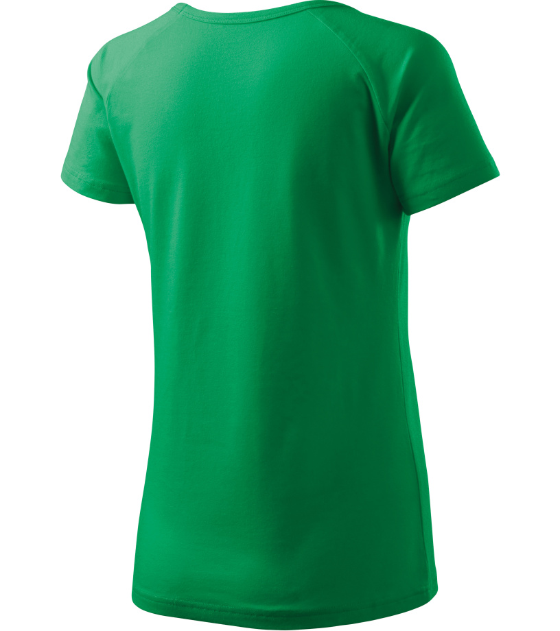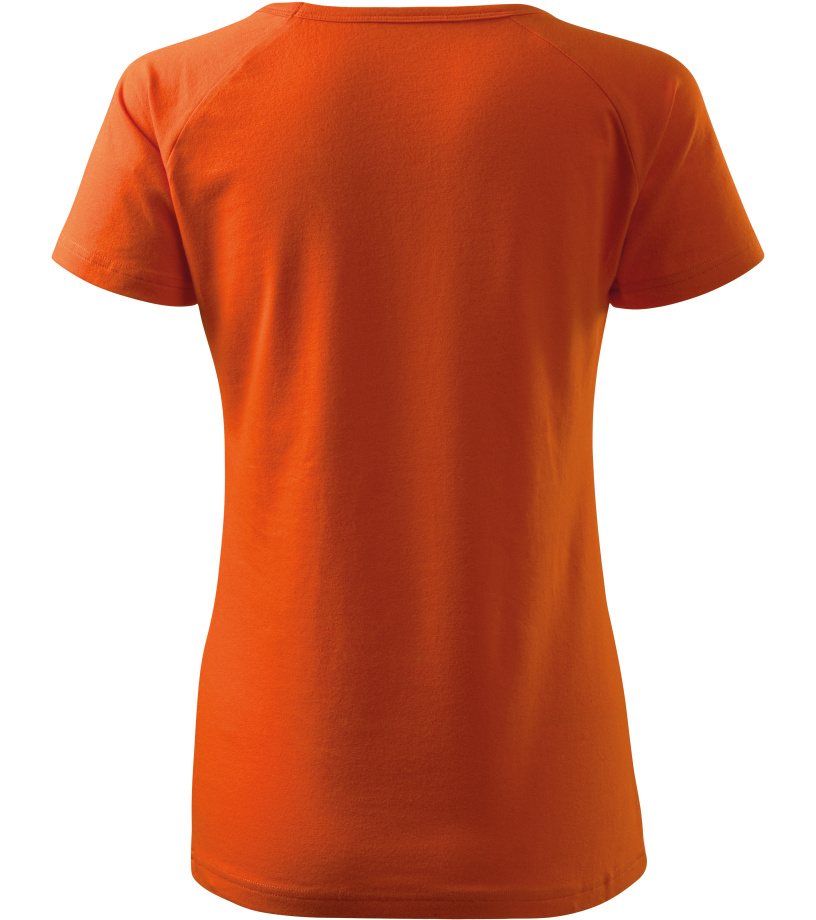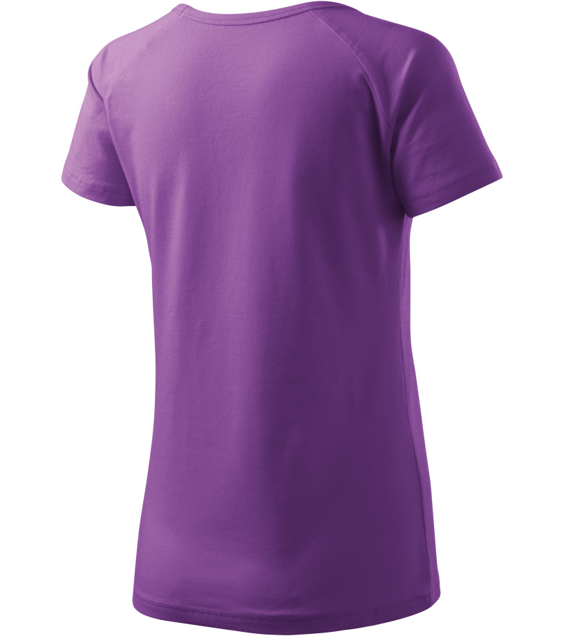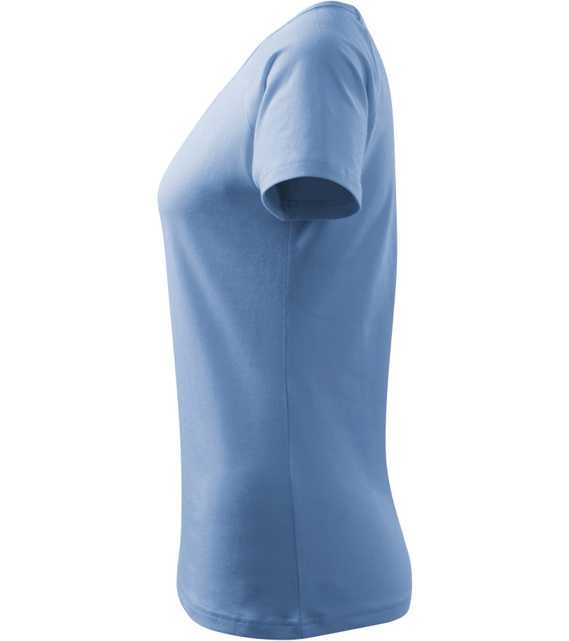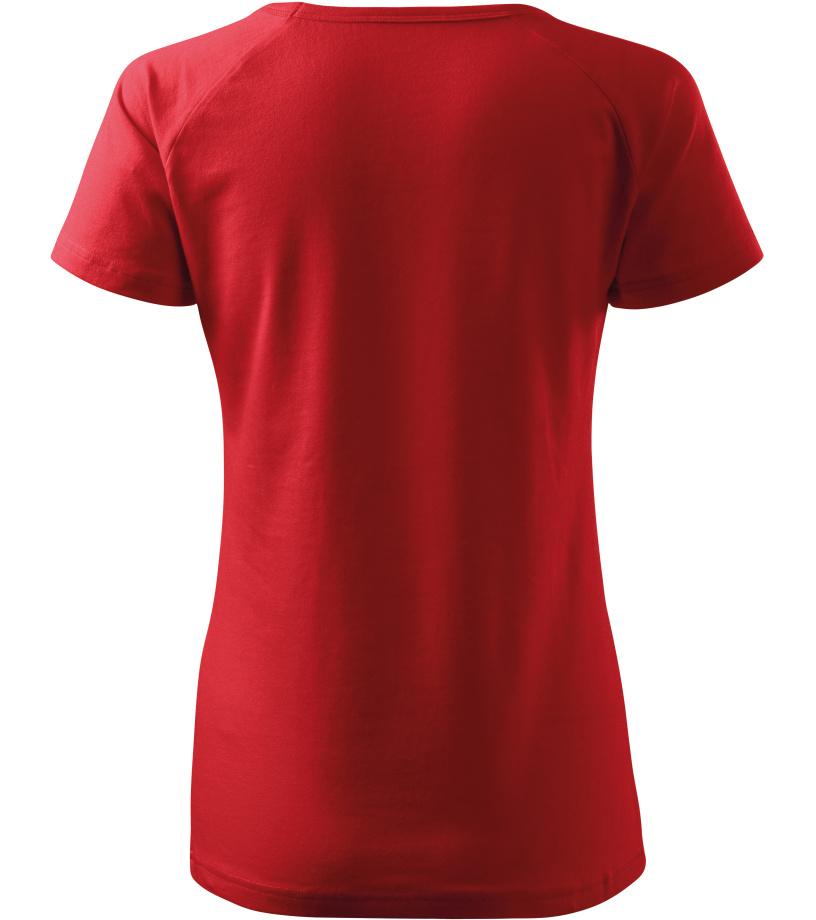 Kvalitní dámské triko přiléhavého stříhu s bočními švy, výstříhem ve tvaru V a krátkými raglánovými rukávy ze strečového materiálu udržujícího stálost tvaru vhodné pro potisk a výšivku má průkrčník lemován vrchovým materiálem