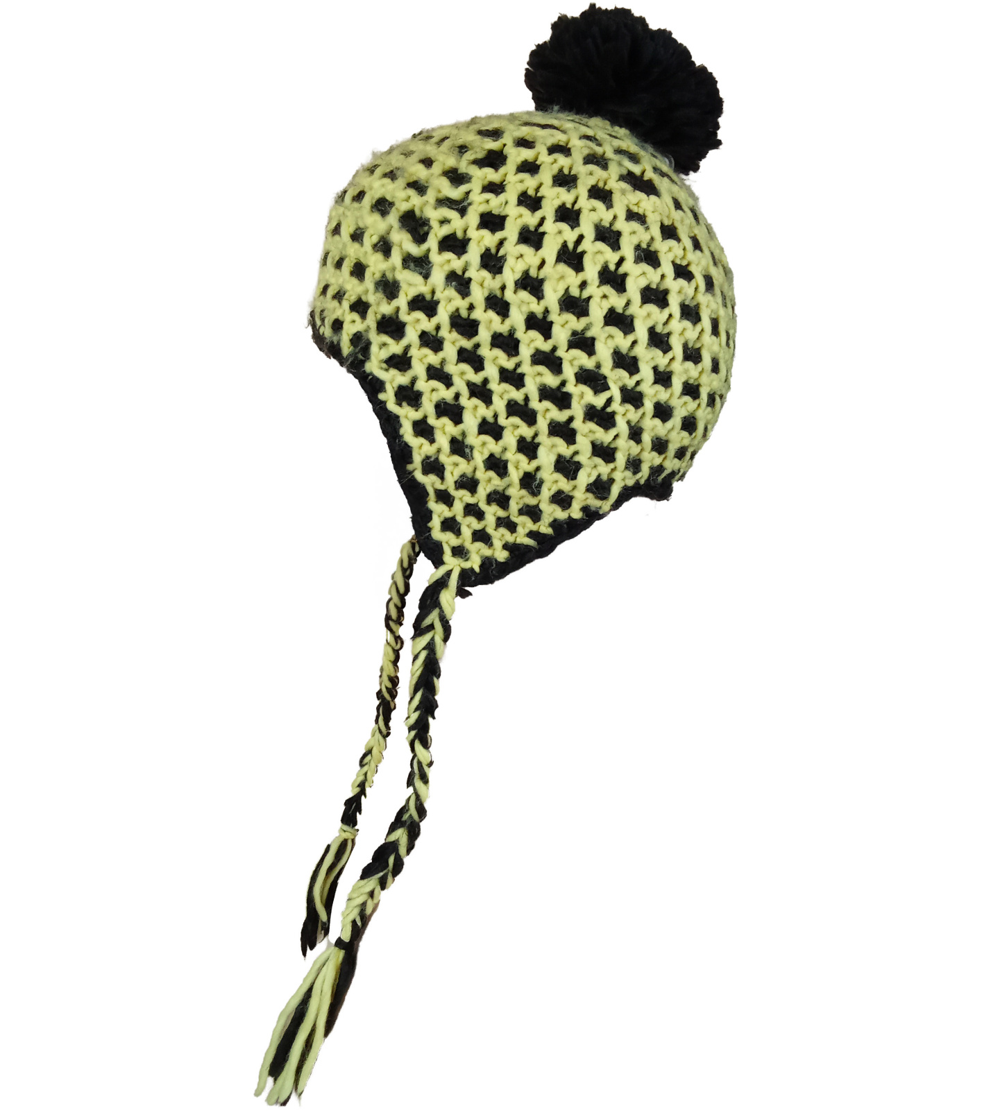 Zimní pletená čepice s bambulí a copánky. Stylová a hřejivá zimní čepice, která vás spolehlivě ochrání před chladem. Má originální háčkovaný vzor v kontrastní kombinaci černé a světle žluté barvy. Uši jsou chráněny prodlouženými klapkami, ze kterých visí pletené copánky, jež lze nechat volně viset nebo svázat. Na vrchu čepice je hravá černá bambule, která dodává čepici moderní a mladistvý vzhled.