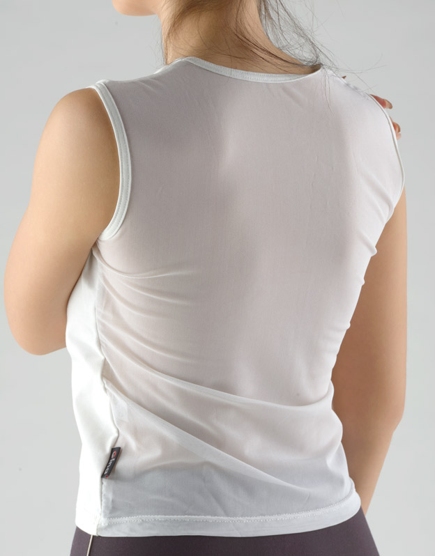 Tričko do pasu bez rukávů s tylovým zadním dílem, dámské šité sportovní prádlo. Průramky a průkrčník jsou začištěny lemovacími proužky. Tričko je jednobarevné. V bočním kraji je všité logo.