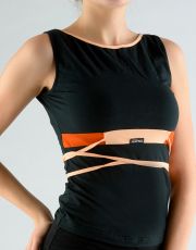 Tričko do pasu bez rukávů, dámské šité sportovní prádlo. Průramky a průkrčník jsou začištěny lemovacími proužky. Tričko je pod prsy členěné a má našitu ozdobnou šňůrku. Tričko je jednobarevné s kontrastním lemováním a šňůrkou. Na předním díle je našité logo.