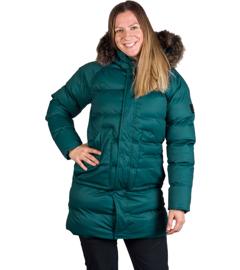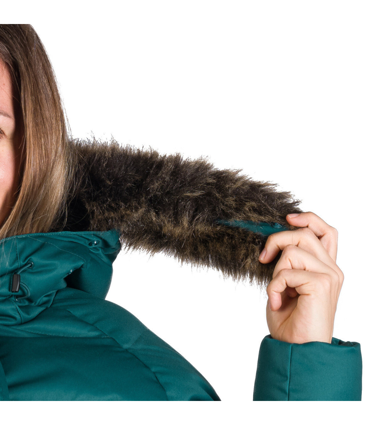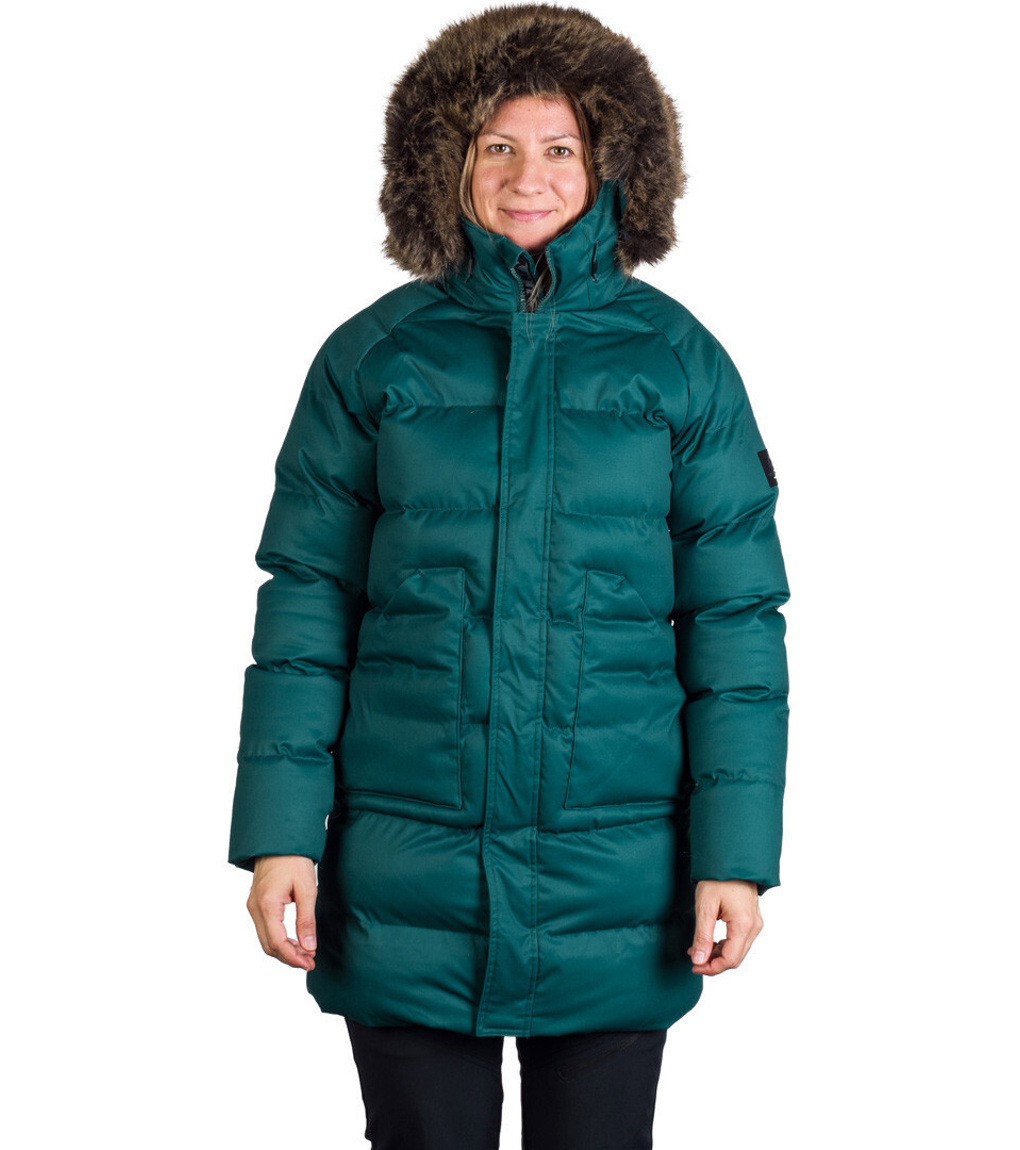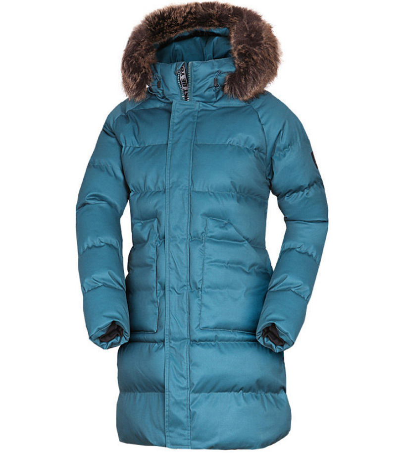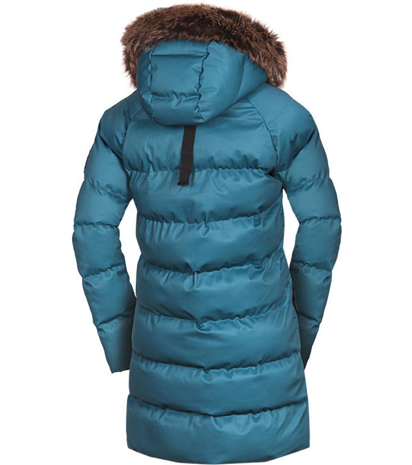 Dámská zimní bunda vhodná do města i na hory. Má pevnější materiál s keprovou vazbou a voděodolnou úpravou. Bunda je velmi teplá, ochrání tak i ve větších mrazech. Kožešina na límci je syntetická a snadno odpínatelná. Střihově je bunda lehce vytvarovaná kolem pasu s jemně prodlouženou délkou pod boky. Dvě velké kapsy na předním díle jsou zajímavým ozdobným prvkem, na vnitřní straně bundy je navíc malá kapsička na zip na drobnosti. Na vnitřní straně rukávů naleznete elastické manžety, které pěkně přilnou k zápěstí a zabrání tak profouknutí.