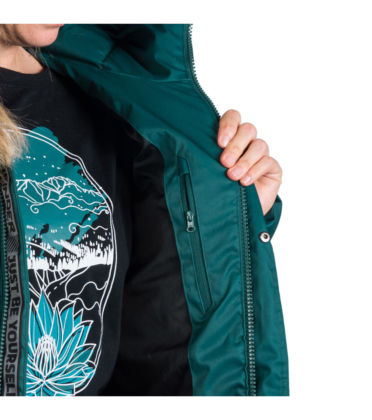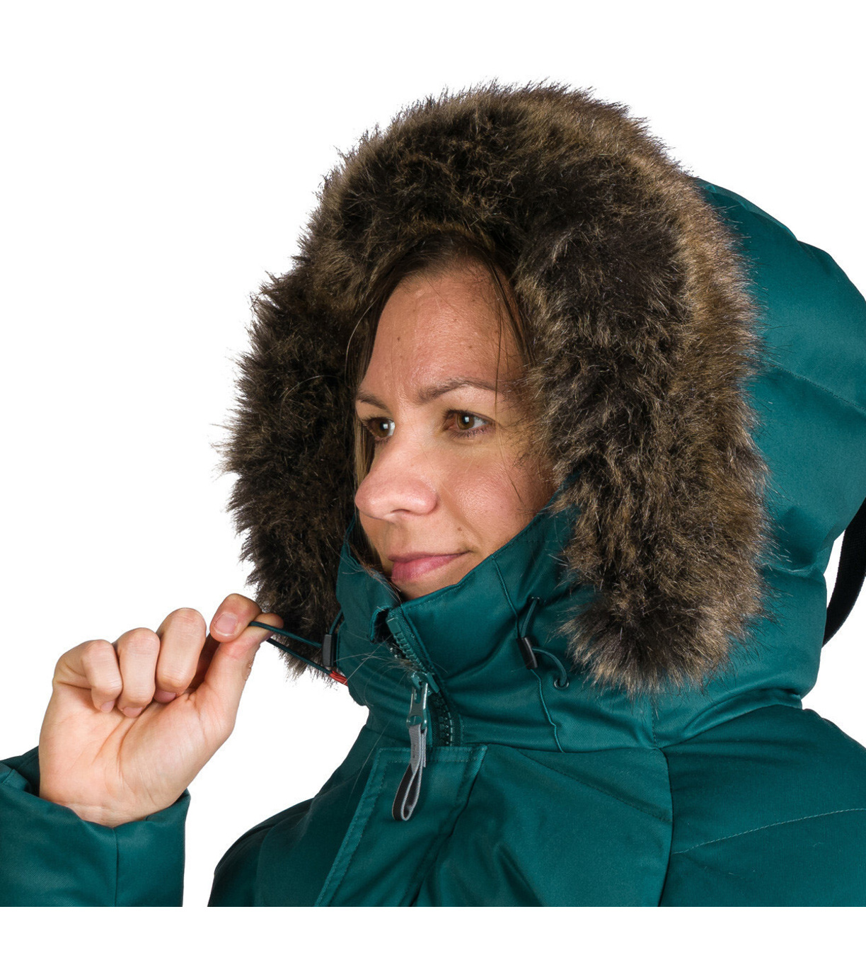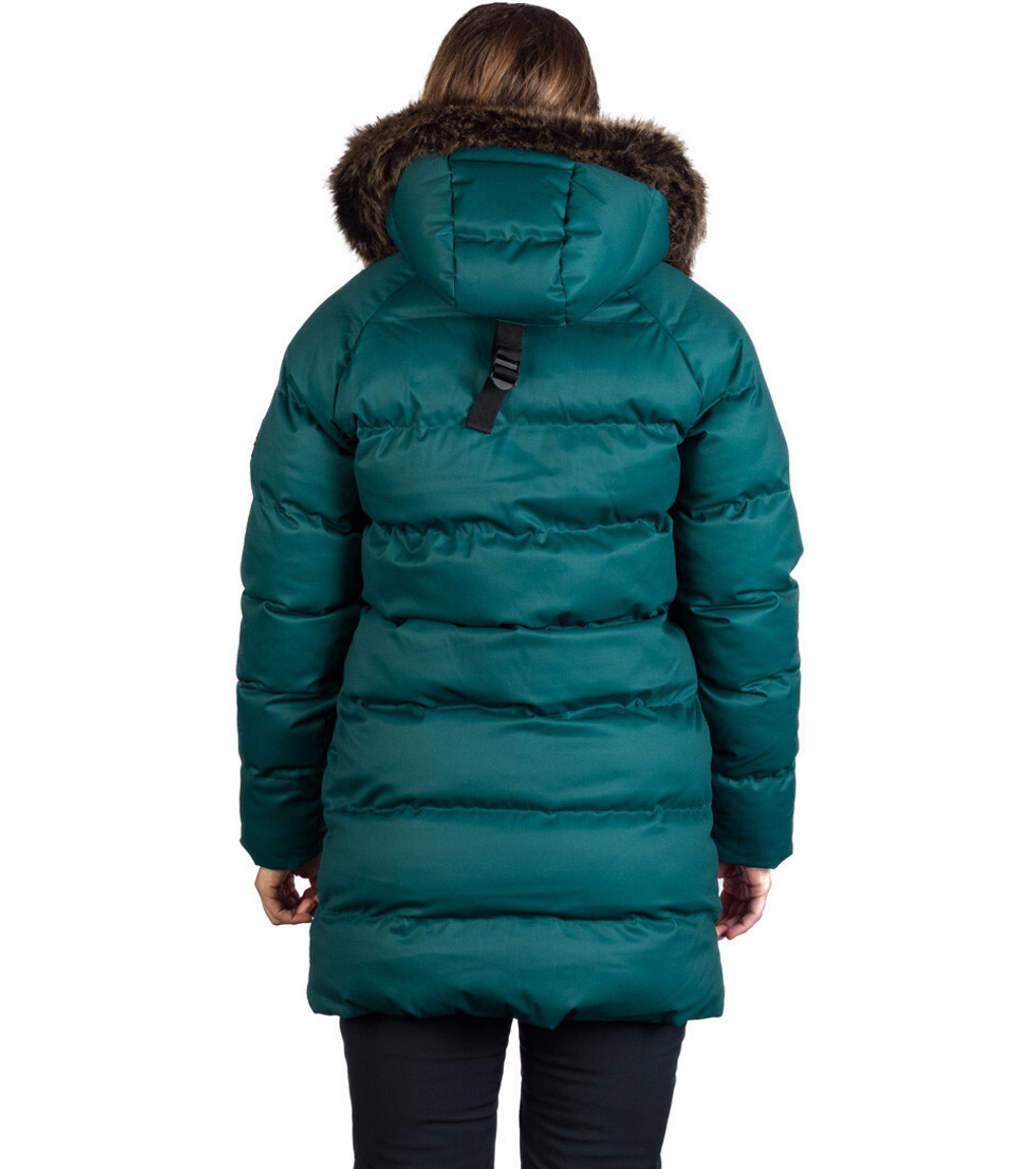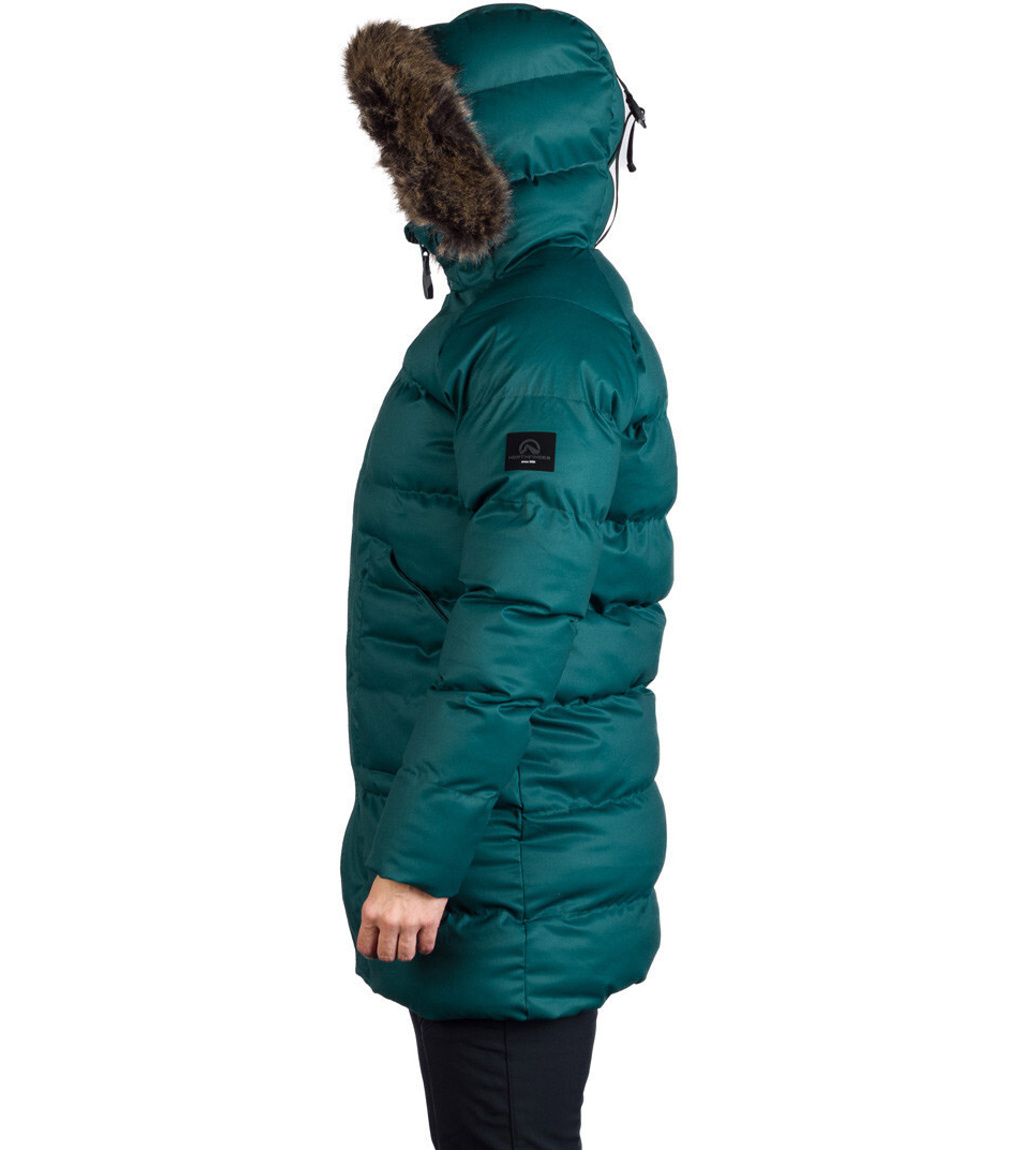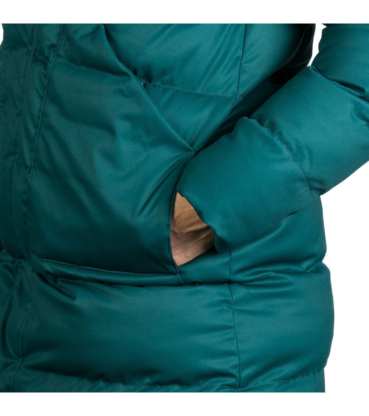 Dámská zimní bunda vhodná do města i na hory. Má pevnější materiál s keprovou vazbou a voděodolnou úpravou. Bunda je velmi teplá, ochrání tak i ve větších mrazech. Kožešina na límci je syntetická a snadno odpínatelná. Střihově je bunda lehce vytvarovaná kolem pasu s jemně prodlouženou délkou pod boky. Dvě velké kapsy na předním díle jsou zajímavým ozdobným prvkem, na vnitřní straně bundy je navíc malá kapsička na zip na drobnosti. Na vnitřní straně rukávů naleznete elastické manžety, které pěkně přilnou k zápěstí a zabrání tak profouknutí.