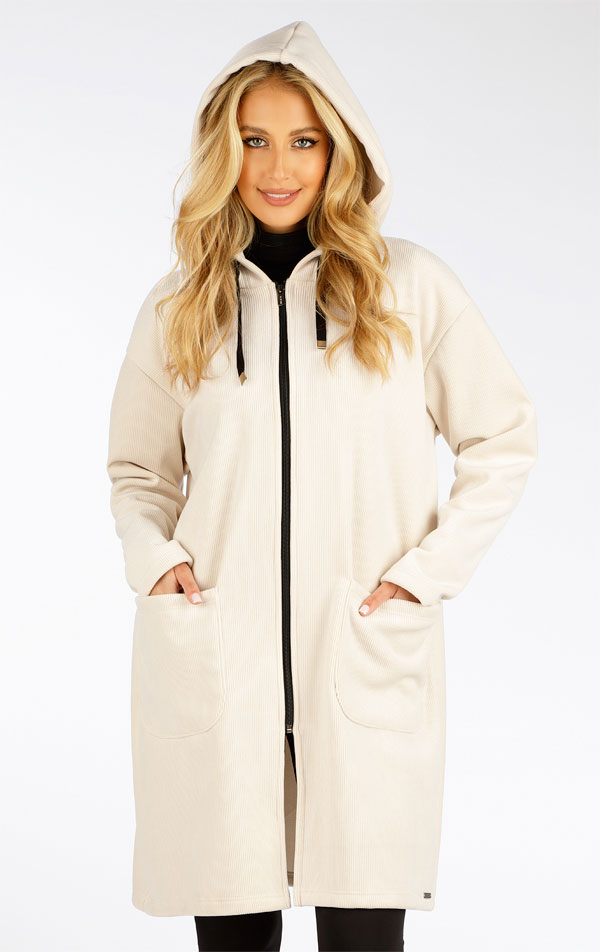 Volný střih. Kapuce s tkanicí se stříbrnými koncovkami. Zapínání na zip. Kapsy na předním díle. Originální vzhled fleecového materiálu, který strukturou připomíná manžestr. Kabátek je velmi pružný, hřejivý a příjemný na nošení. Má výborné termoizolační vlastnosti a je vhodný jako druhá vrstva oblečení.