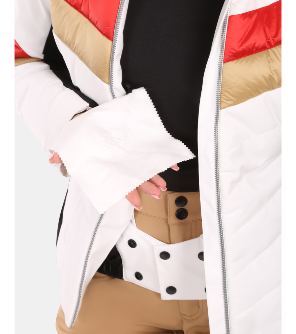 Všitá ochraná sněhová manžeta, která zabraňuje pronikání sněhu pod oděv. Ve spodní části je našita elastická protismyková guma.