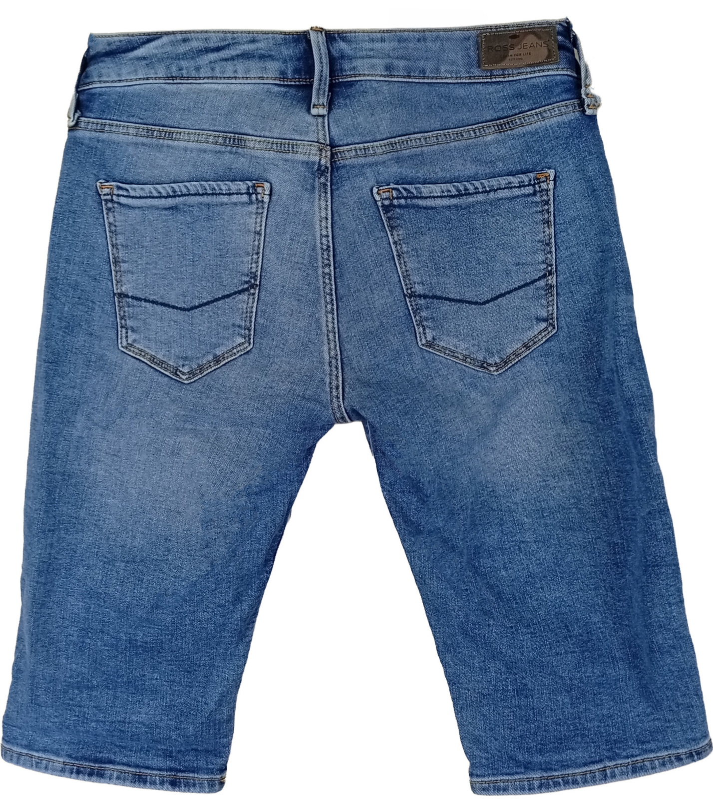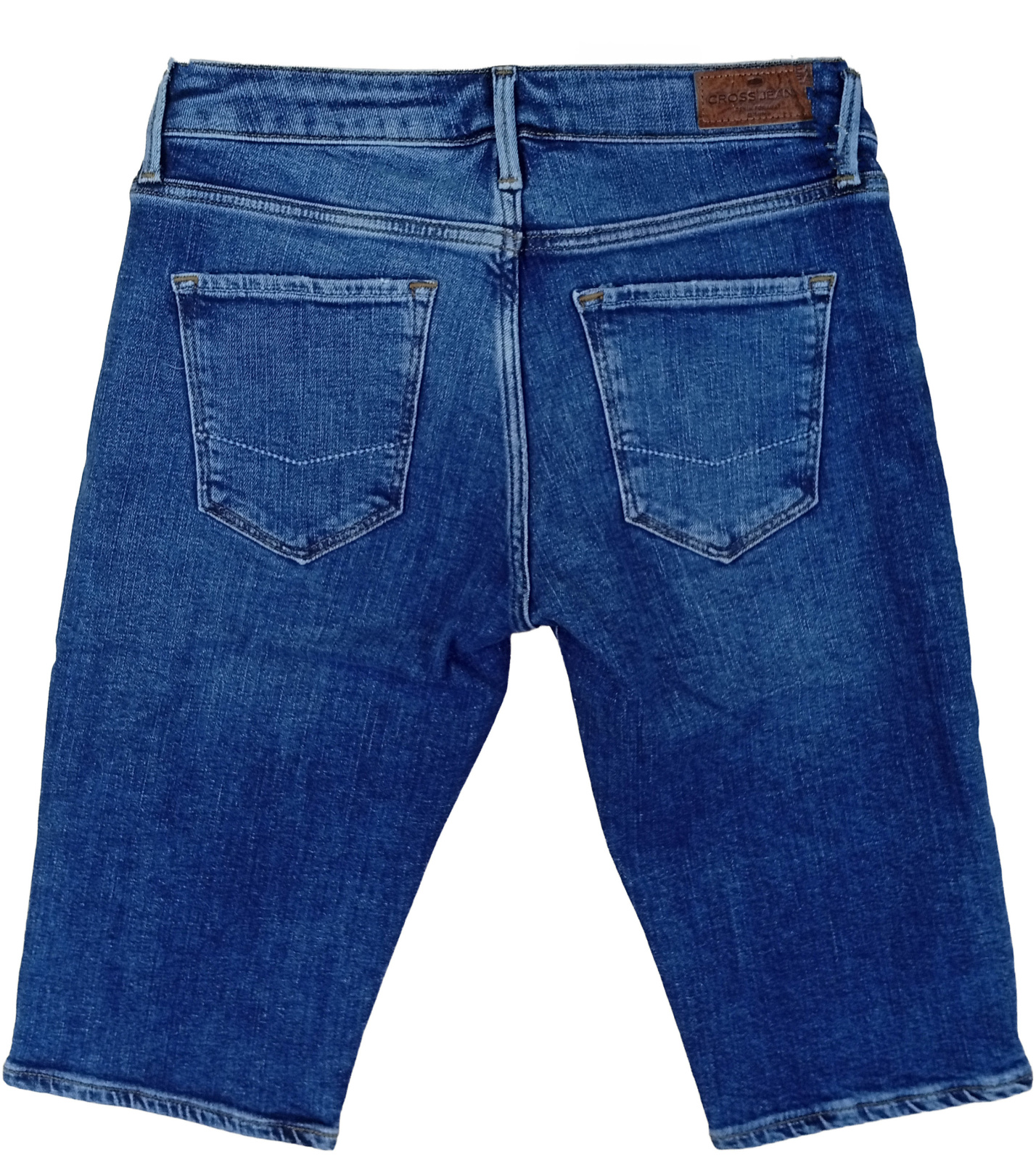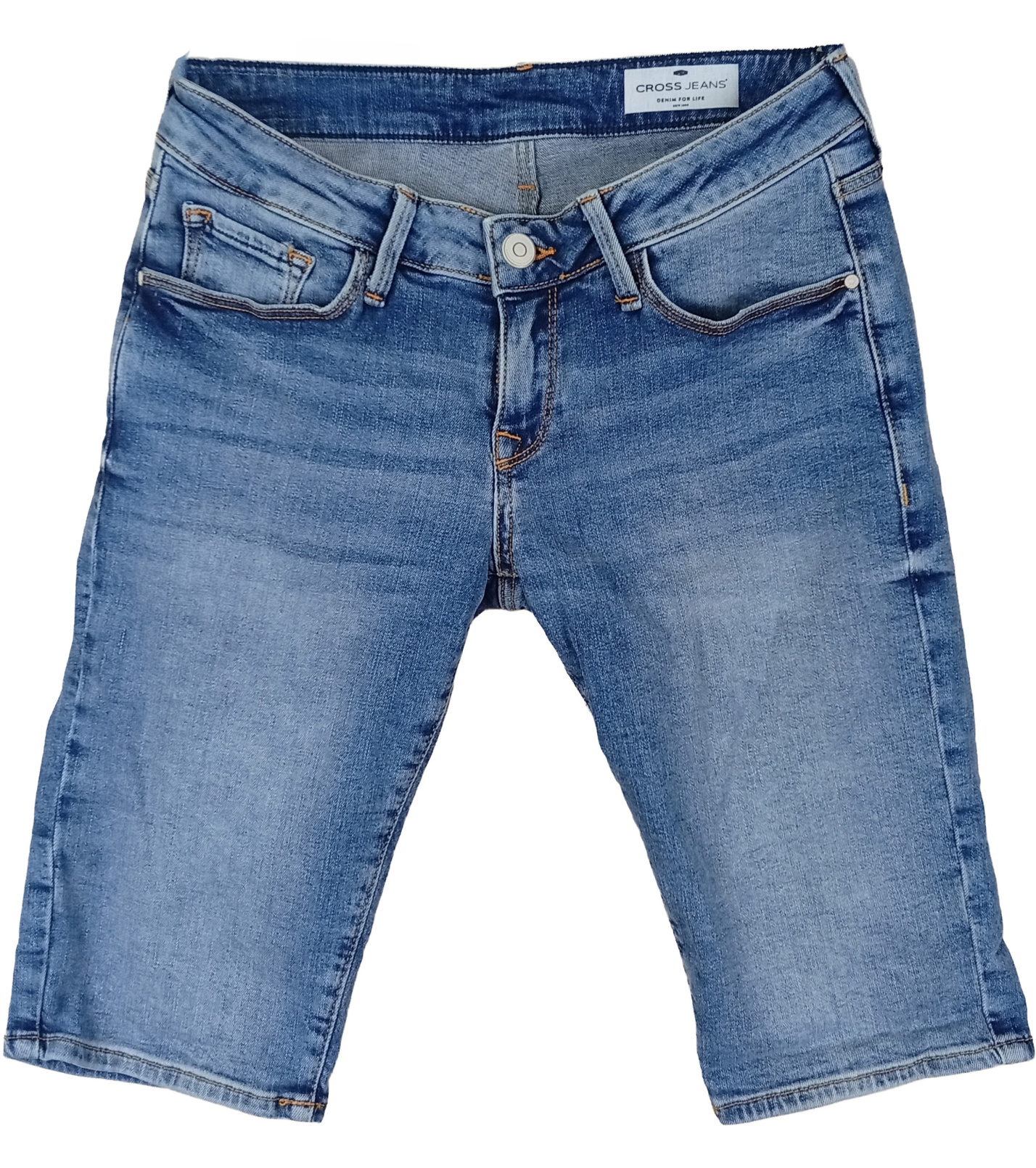 Dámské džínové kraťasy značky Cross Jeans v klasickém modrém odstínu s lehce opraným efektem. Pohodlný střih s délkou nad kolena je ideální na každodenní nošení i volný čas. Díky zapínání na knoflík a zip a tradičnímu pěti­kapsovému stylu působí nadčasově a snadno se kombinují s tričkem, košilí nebo letní halenkou. Jemně elastický denim se postará o příjemné nošení a dokonalé přizpůsobení postavě. Tyto šortky jsou skvělou volbou pro ženy, které hledají univerzální kousek do letního šatníku.
