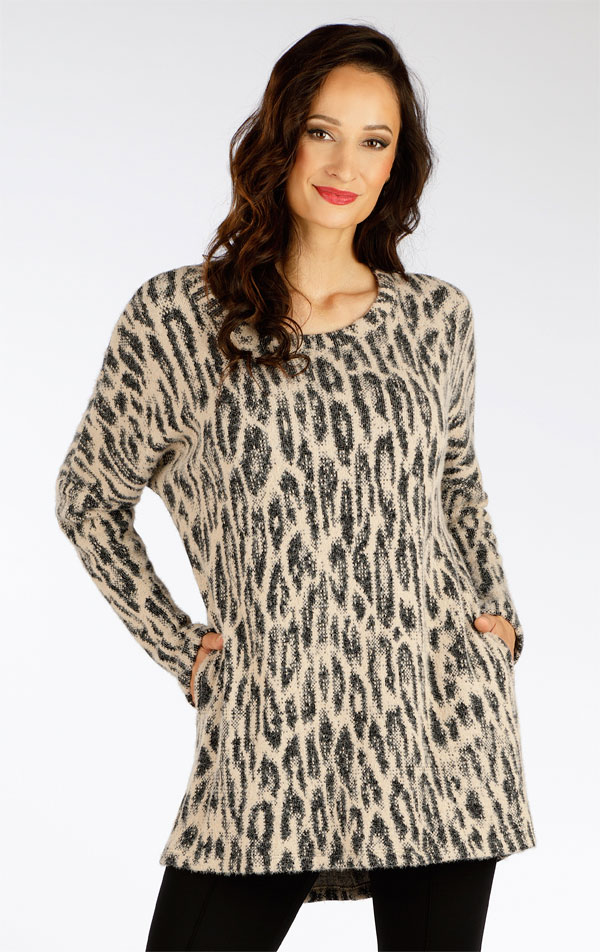 Volný střih s kulatým výstřihem a delším zadním dílem. Praktické boční kapsy. Silnější pletenina se zvířecím vzorem je pružná a příjemná na těle. Originální tunika, která Vás zahřeje a je praktická na údržbu. Délka tuniky cca 85 cm.