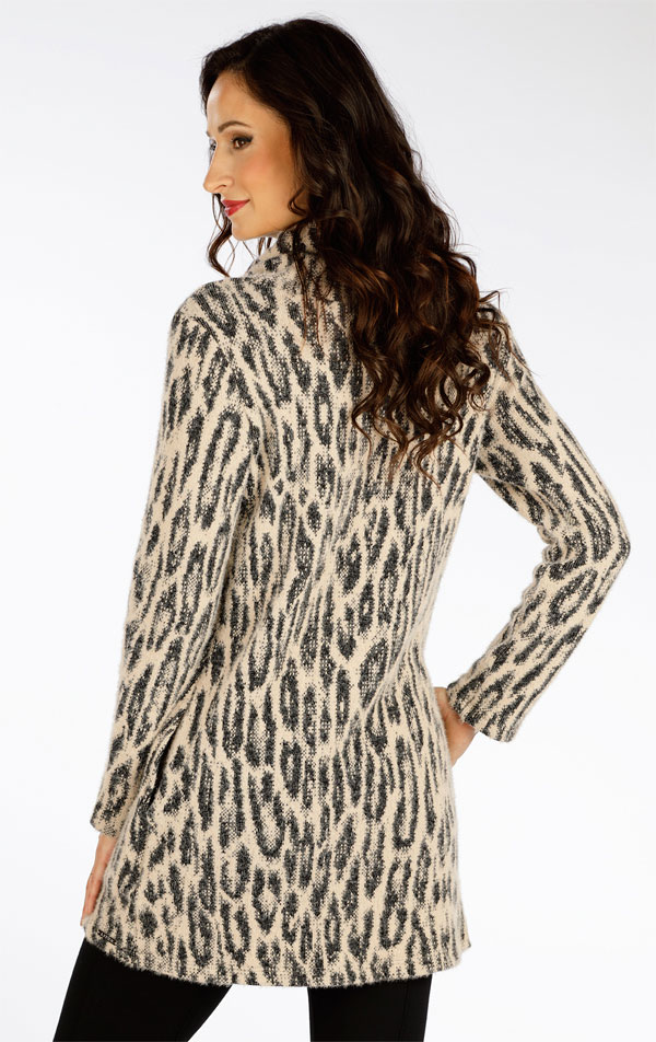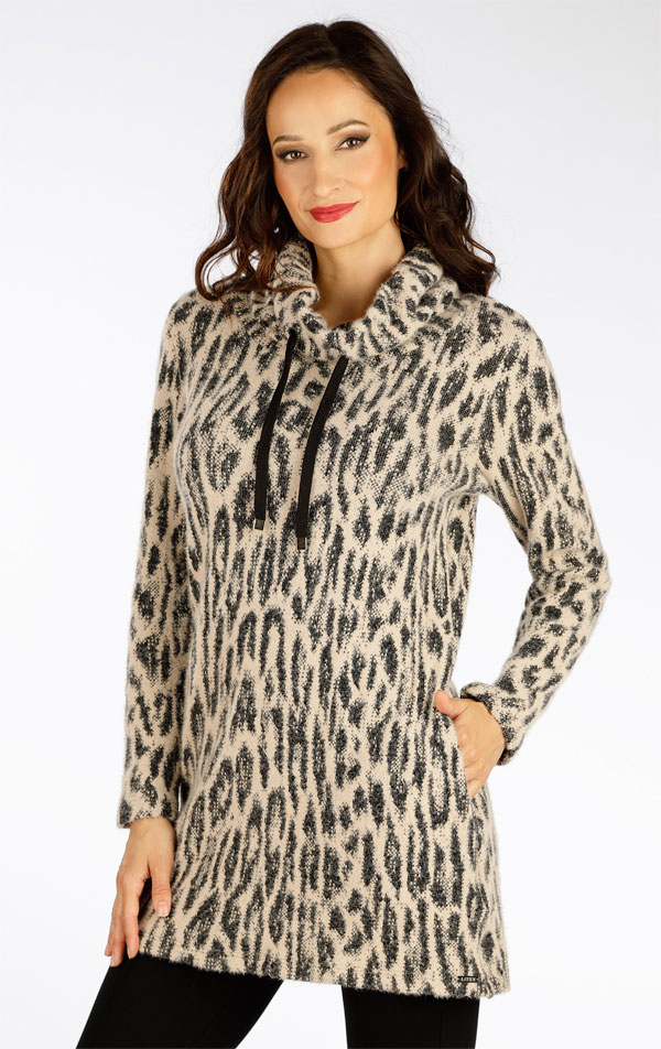 Vysoký stoják s průchodkami a tkanicí se stříbrnými koncovkami. Praktické boční kapsy. Silnější pletenina se zvířecím vzorem je pružná a příjemná na těle. Originální tunika, která Vás zahřeje a je praktická na údržbu.
