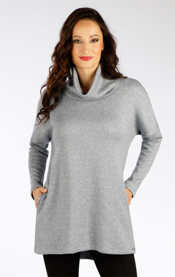 Volný střih se spadlým rolákem. Delší zadní díl a praktické boční kapsy. Kvalitní pletenina se stříbrným vláknem je pružná a tvarově stálá. Příjemná rubová strana pro komfortní nošení. Délka tuniky cca 85 cm.