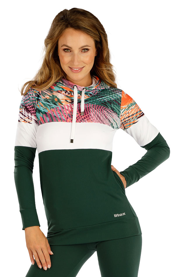 Dámská funkční mikina. Kapuce s bílou podšívkou a průchodkami s tkanicí na stažení s ozdobnými koncovkami. Boční kapsy. Materiál je odolný vůči pachům a velmi rychle schne. V kombinaci s elastanem je velmi pružný a nebrání v žádném pohybu. Praktický a stylově vypadající základ sportovních i volnočasových outfitů.