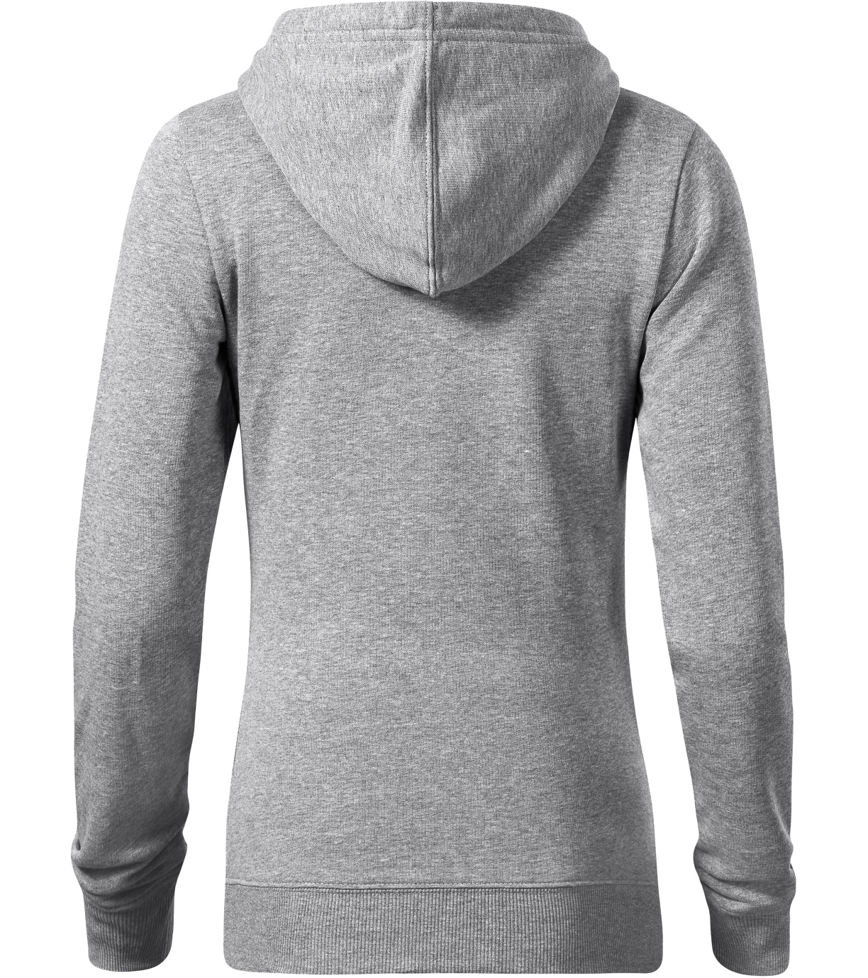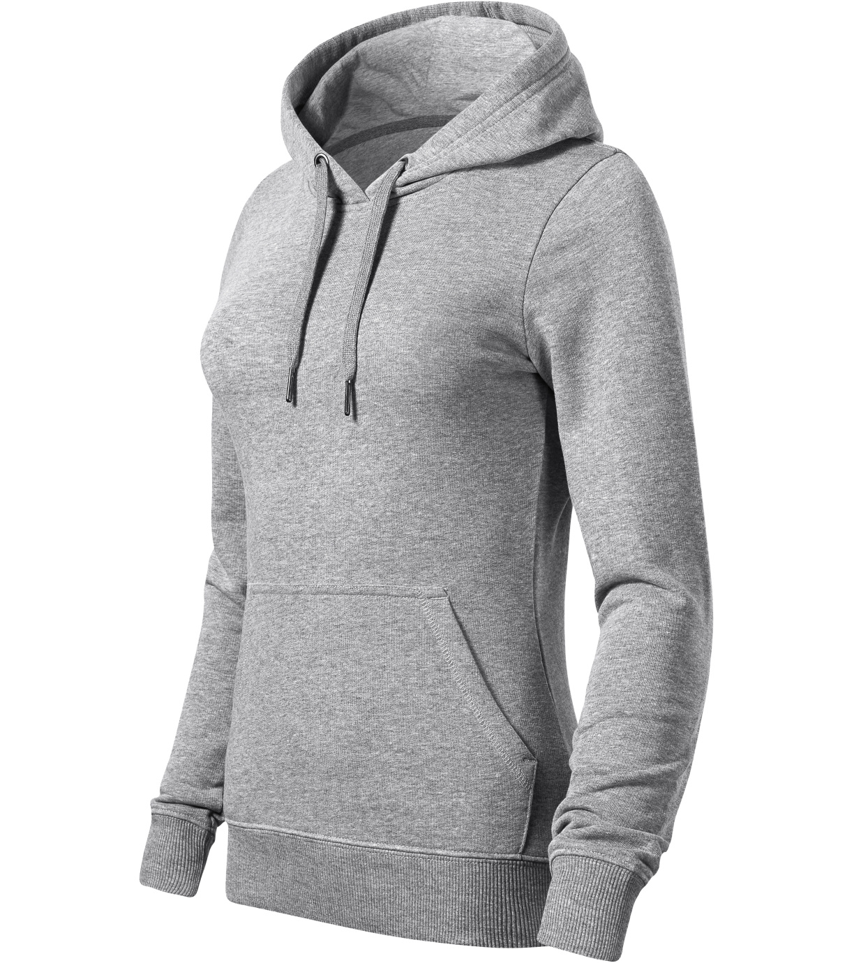 Dámská mikina z certifikovaného recyklovaného polyesteru. Bez etikety - připraveno na rebranding. Lehce vypasovaný střih s bočními švy. Kapuce s podšívkou, na stažení šňůrkou, vnitřní část průkrčníku začištěna páskou v barvě vrchového materiálu. Nakládaná kapsa ve stylu klokanky. Dolní lem a manžety rukávů z žebrového úpletu 2:2 s 5 % elastanu. Výplňková pletenina, vnitřní strana nepočesaná.