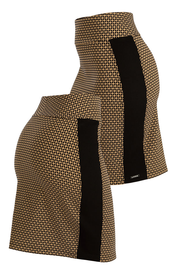 V pase široký pružný pásek. Úzký střih s černými pruhy na bocích pro efekt zeštíhlení. Pružná, nemačkavá sukně v nadčasové barevné kombinaci, je tvarově stálá a velmi komfortní při celodenním nošení. Délka sukně 52 cm.