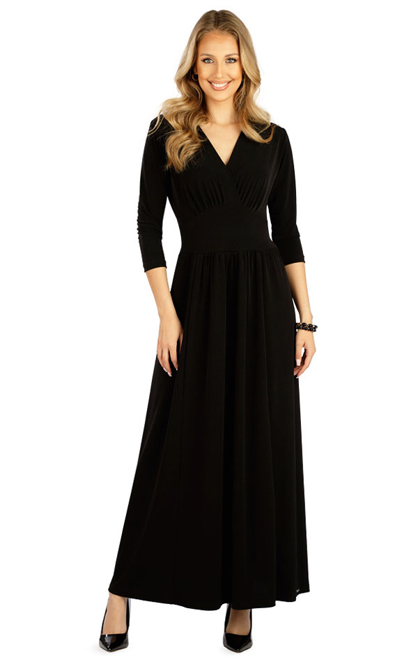 Dámské dlouhé šaty s 3/4 rukávem. Výstřih do V. Pružný široký pásek v pase. Sklady v délce sukně. Příjemný a pružný materiál. Velmi splývavý a pružný nemačkavý materiál Vám zajistí maximálně příjemný pocit při nošení. Elegantní kousek nepostradatelný ve Vašem šatníku. Délka šatů cca 140 cm.