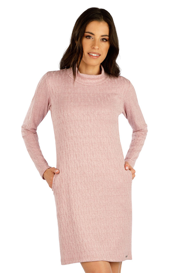 Dámské pleteninové šaty. Přiléhavý střih. Stoják. Praktické boční kapsy. Pletenina plastického copánkového vzoru s příměsí viskózy a elastanu je velmi příjemná na těle, velmi dobře pruží a nemačká se. Délka šatů cca 90 cm.