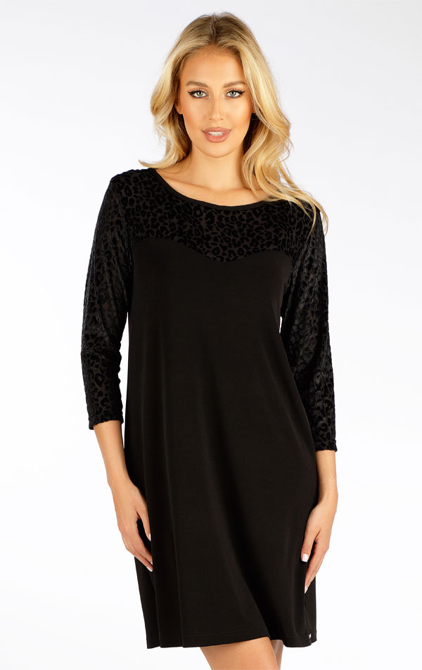 Leopardí průhledný sametový vzor na rukávech a v horní části šatů. Spodní část z hladkého pružného a splývavého materiálu. Kombinace materiálů dodává šatům velmi ženský vzhled. Jsou vhodné nejen na běžné nošení, ale i k slavnostní příležitosti. Délka šatů cca 85cm.