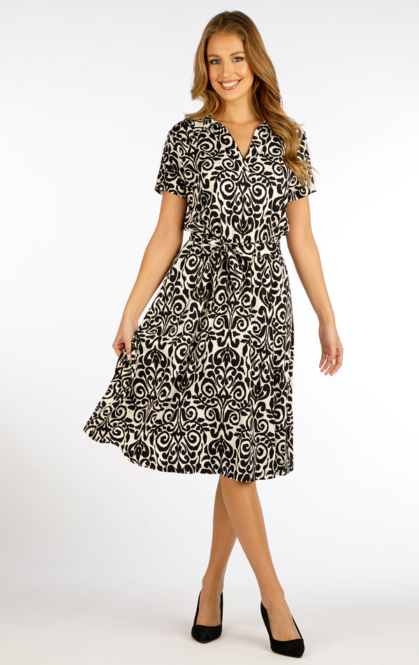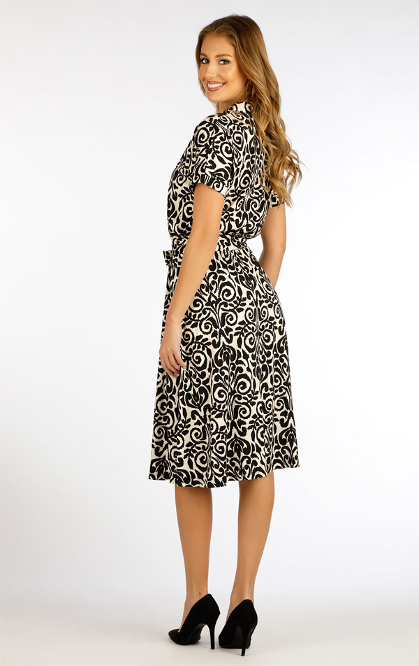 Dámské šaty s krátkým rukávem. Elegantní šaty volného střihu s límečkem a ležérním výstřihem. V pase přestřižené s páskem na zavázání. Lehký tkaný materiál s vysokým podílem viskózy a přítomnost elastanu zaručuje neobyčejně příjemný pocit při nošení, je prodyšný a nemačká se. Velmi praktický a pohodlný kousek v moderním střihu, který skvěle doladí Váš outfit. Délka šatů cca 105cm.