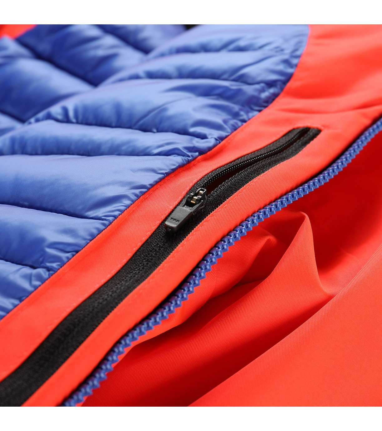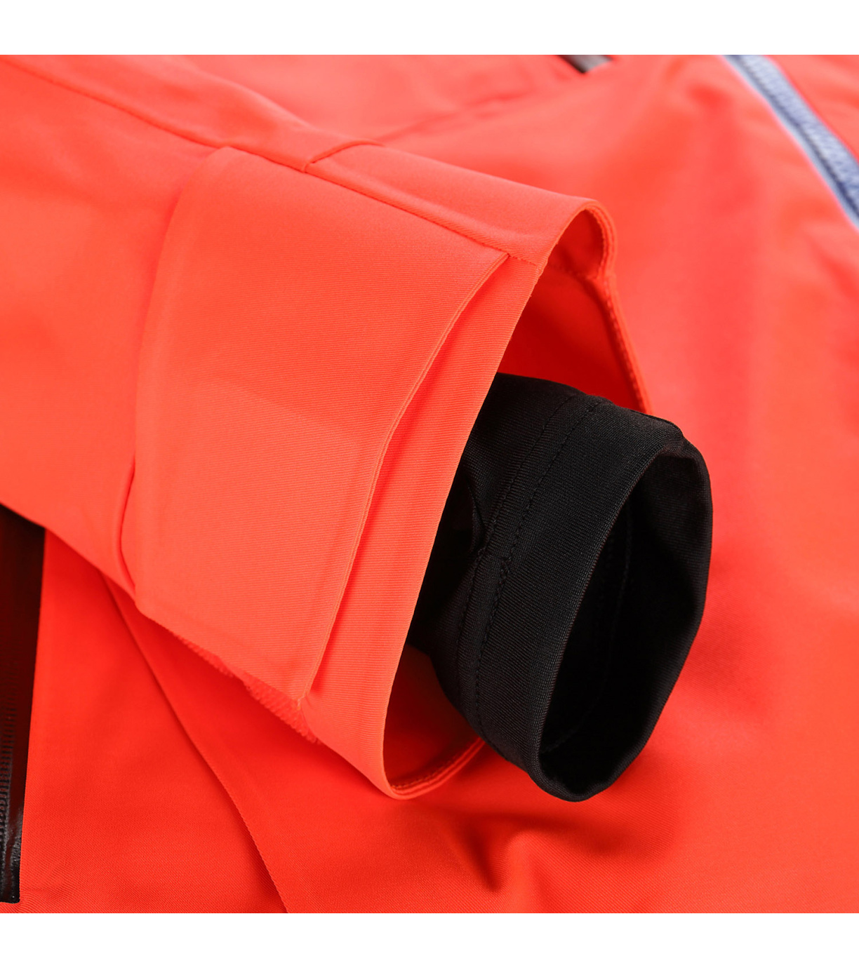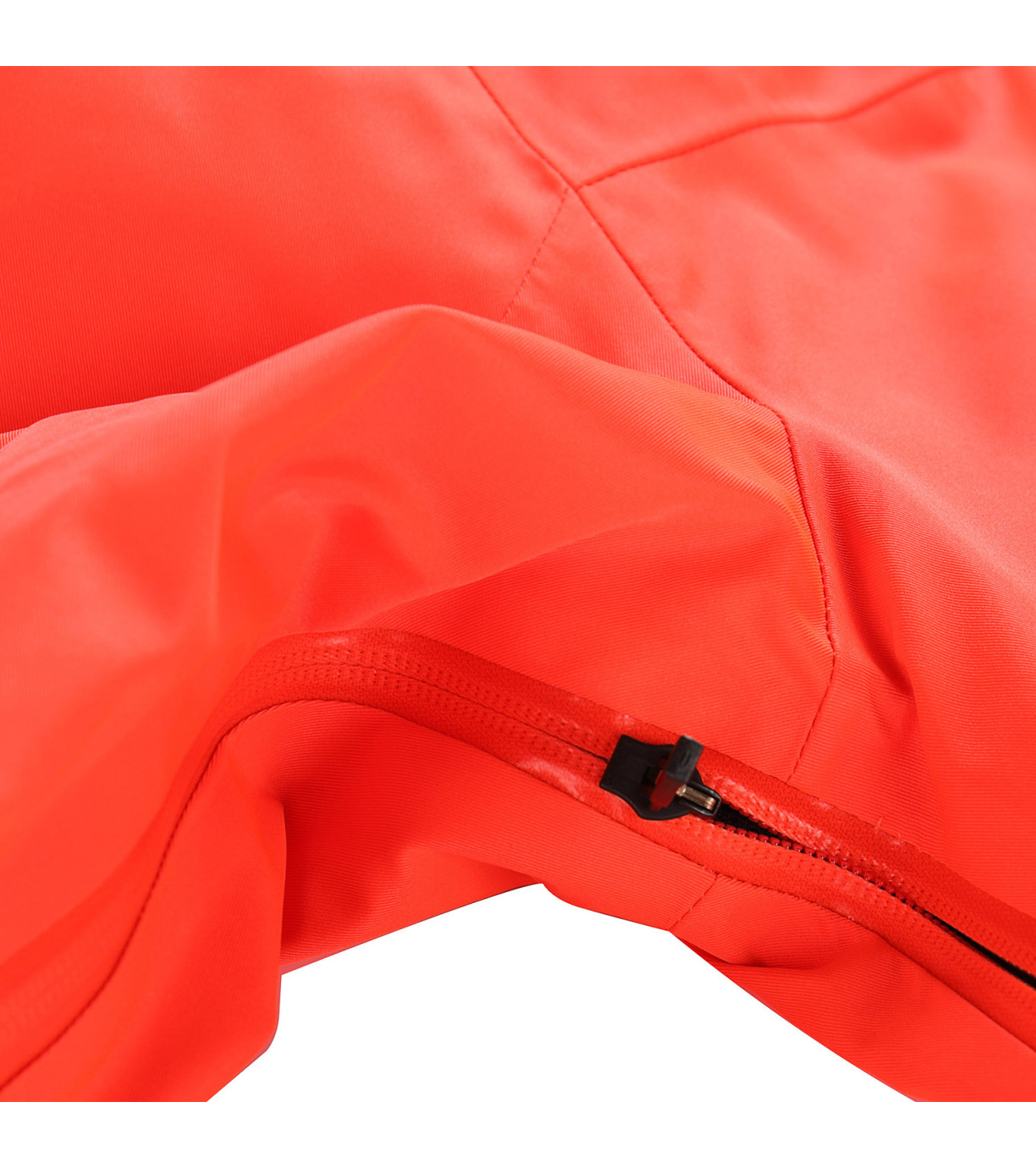 Pro maximální pohodlí na svahu nechybí odepínatelný sněhový pás, prodloužená zadní část se stahovací gumičkou a praktické kapsy – celkem 7: kapsa na skipas na rukávu s voděodolným zipem, dvě přední kapsy na zip, vnitřní zipová kapsa, kapsa ze síťoviny na lyžařské brýle a další úložné prostory na drobnosti. Design doplňuje silikonový potisk na předním díle a na rukávu.
