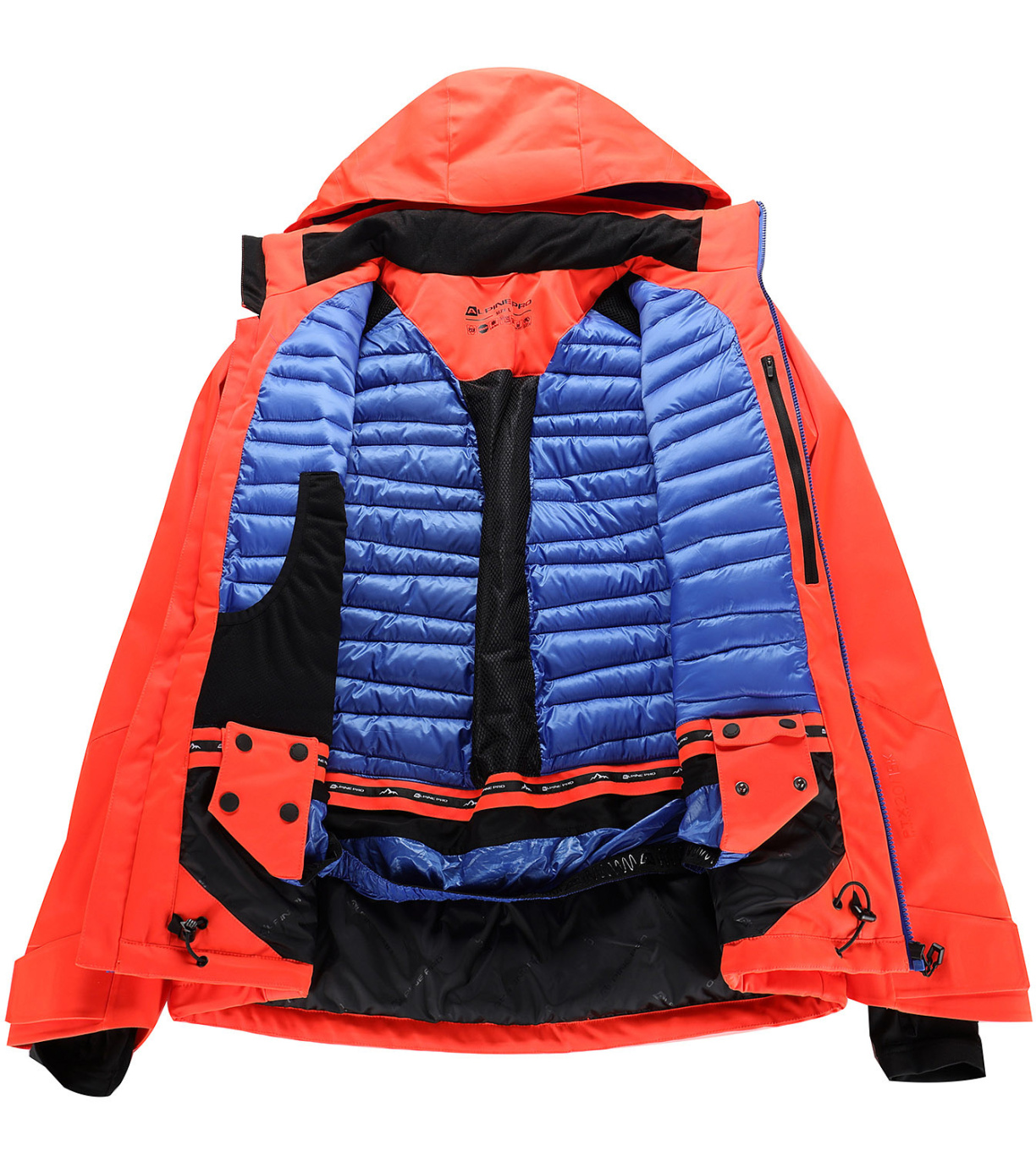 Pánská lyžařská bunda je navržena pro náročné lyžaře, kteří očekávají maximální funkčnost a spolehlivou ochranu v horách. Je vyrobena z pružného, vodoodpudivého, nepromokavého a větruodolného materiálu s vysoce odolnou membránou PTX SNOW (vodní sloupec 20 000 mm, paropropustnost 15 000 g/m²/24 h, Ret < 6) a povrchovou úpravou DWR, která zajišťuje dlouhodobou ochranu před vlhkostí i sněhem. Střední hřejivá výplň a kontrastní prošívaná podšívka poskytují komfort a tepelný komfort i v chladných podmínkách.