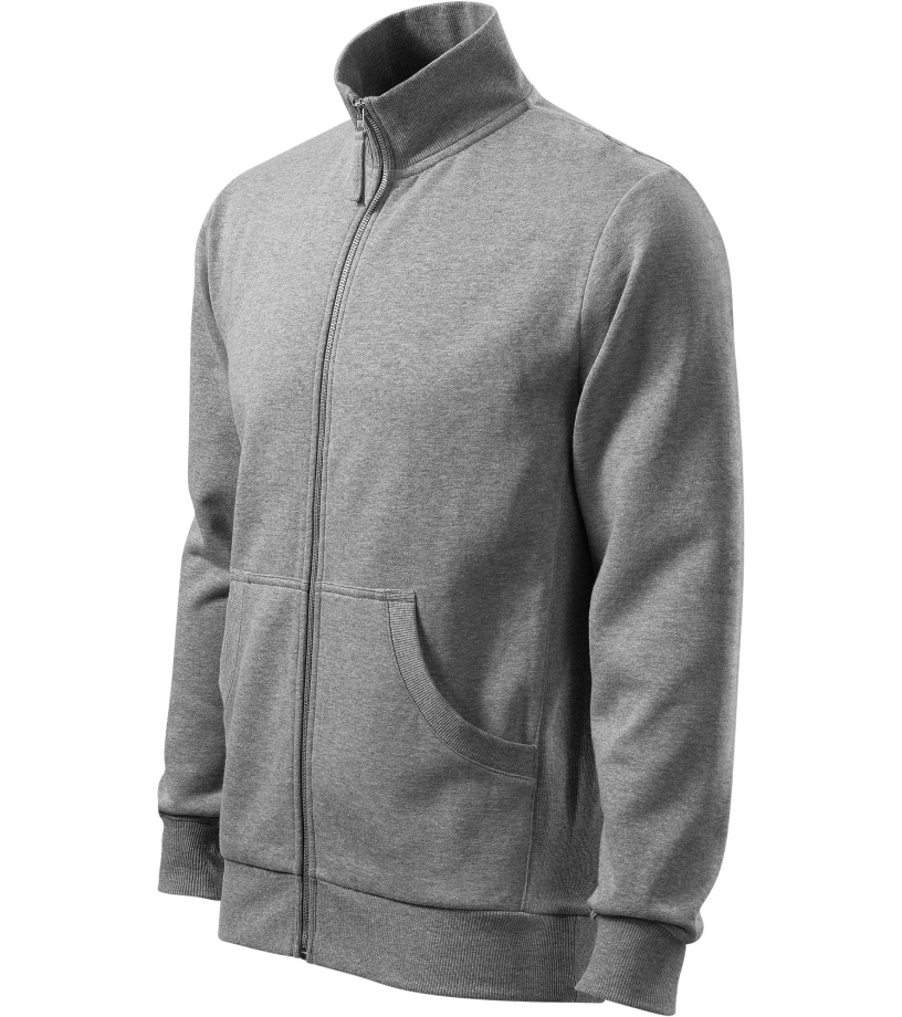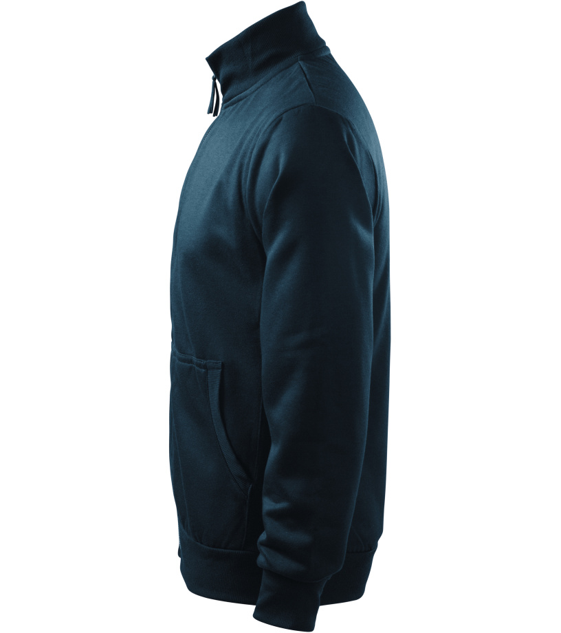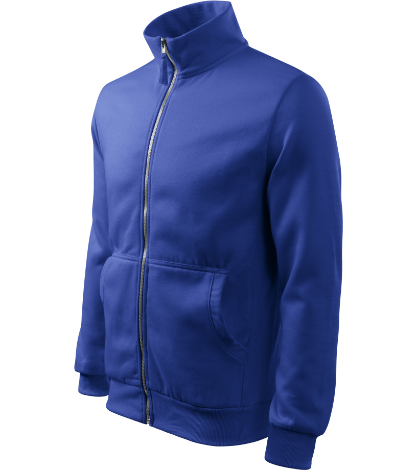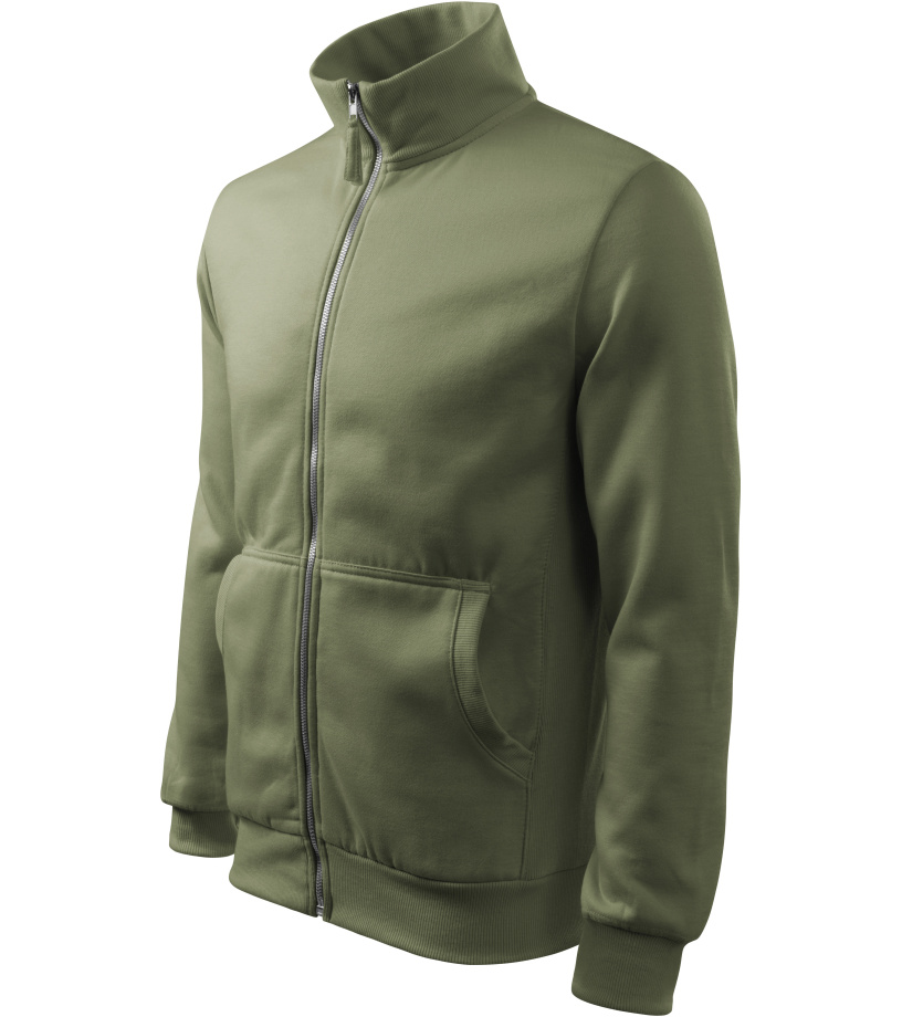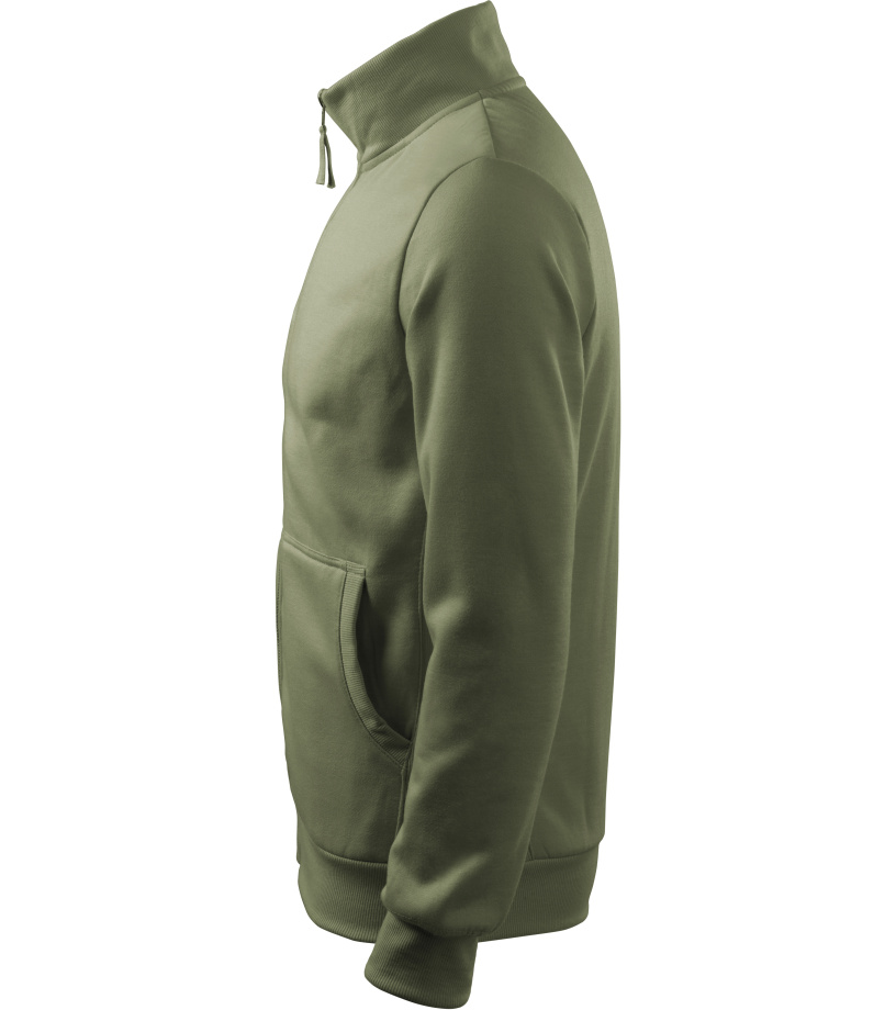 Pánská mikina rovného střihu s bočními díly vhodná pro potisk a výšivky má celopropínací kovový zip, stojáček a boční díly z žebrového úpletu 2:2 s 5 % elastanu, vnitřní průkrčník začištěn kontrastní páskou, nakládané kapsy ve stylu klokanky, vnitřní stranu počesanou a dolní lem, manžety a lemy kapes z žebrového úpletu 2:2 s 5 % elastanu.