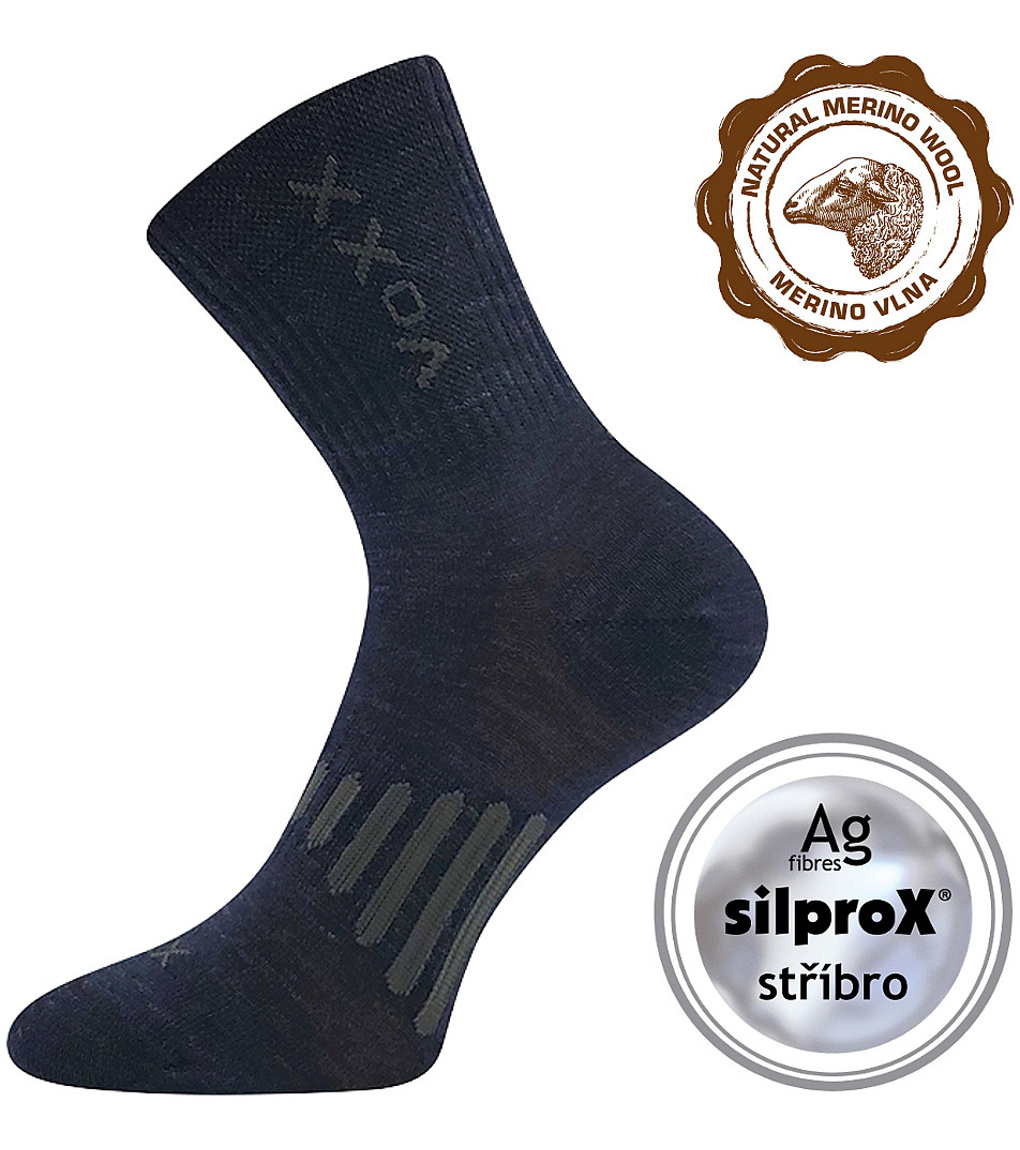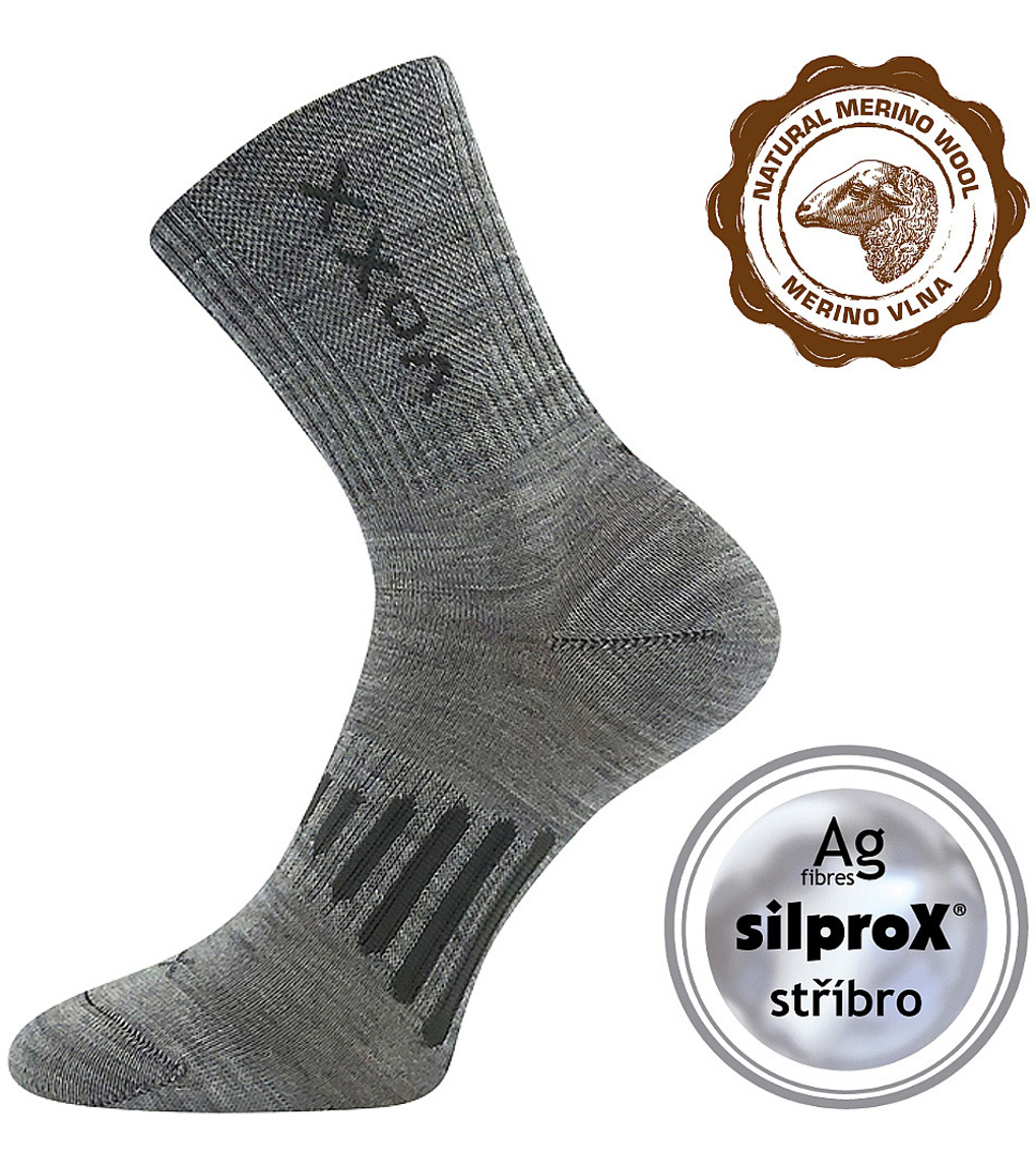 Unisex sportovní vzorované ponožky s vyztuženým chodidlem odolnému proti opotřebení, špice je uzavřena řetízkováním, takže nikde netlačí, merino vlna je přirozeně antibakteriální a navíc je doplněná materiálem silproX s ionty stříbra, elastická zóna na nártu zabraňuje přetočení ponožky v obuvi.