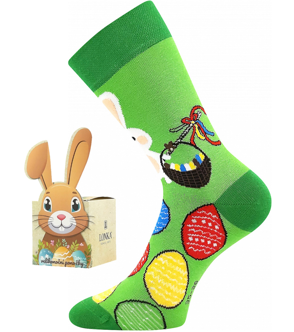 Unisex „trendy“ ponožky Lonka® DEASTER s velikonočním tématem jsou ponožky z vysoce kvalitní česané bavlněné příze. Díky barevným ponožkám můžete skvěle vyjádřit svůj styl, který vás přesně vystihuje, náladu nebo smysl pro detail. Klasické ponožky oživí váš outfit, ať už nosíte oblek nebo džíny. Ponožky jsou vhodné pro každodenní nošení, mají řetízkovanou špici, která netlačí a nevznikají otlaky ani puchýře.