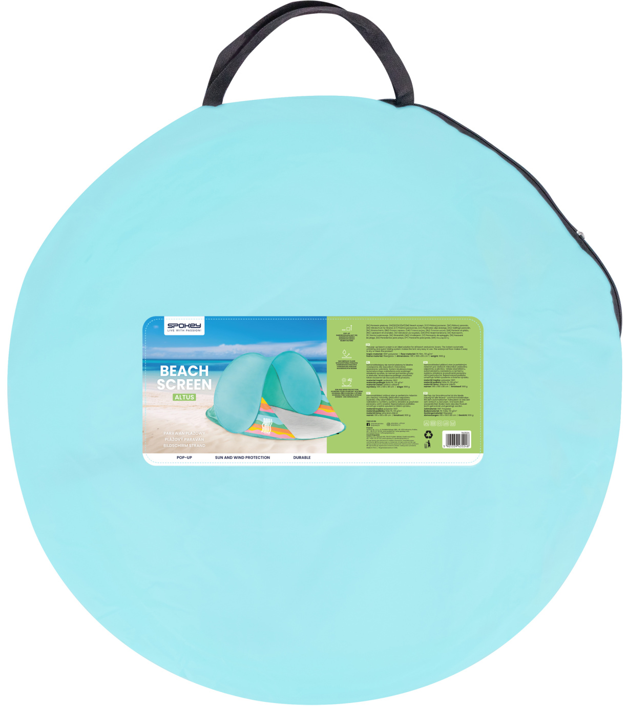 Složení plážového paravanu Spokey je velmi snadné. Stačí jen pár pohybů a paravan se opět změní na lehkou a praktickou obruč. Díky tomu si jej můžete bez problémů vzít na dlouhou cestu autem, vlakem, nebo na výlet do nedalekého parku.