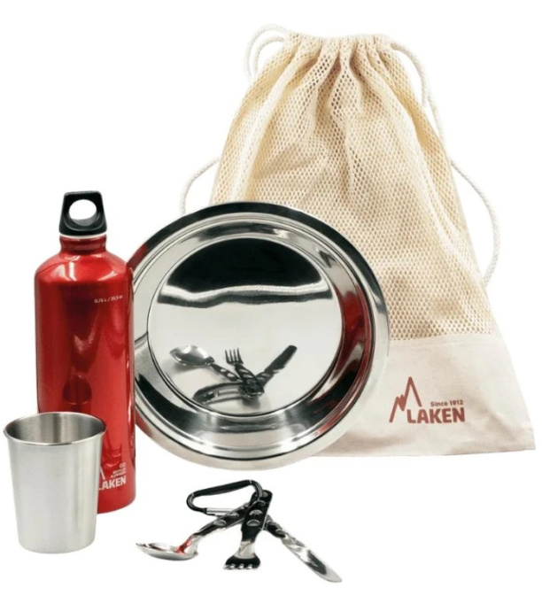 Kompletní kempingová sada obsahuje červenou hliníkovou láhev FUTURA (0,75 l, 100% recyklovaná), nerezový talíř a hrnek, příbor s karabinou a bavlněný sáček na přenášení a sušení.