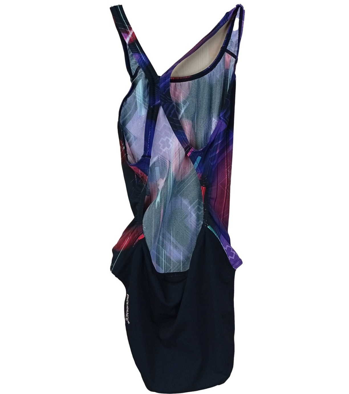 Dámské sportovní jednodílné plavky s moderním abstraktním vzorem v kombinaci tmavých a výrazných barev. Úzká ramínka do kříže zajišťují dobrou oporu a volnost pohybu, takže jsou ideální pro plavání i trénink. Ergonomický střih se přizpůsobí postavě a poskytuje pohodlí při nošení. Odolný materiál je vhodný pro časté používání v bazénu, rychle schne a dlouhodobě si zachovává tvar i barvy. Skvělá volba pro aktivní plavkyně, které hledají funkčnost i styl.